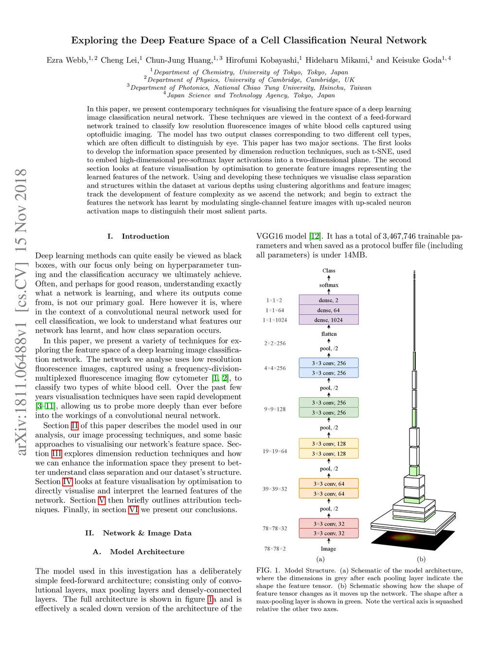 In this paper, we present contemporary techniques for visualising the feature space of a deep learning image classification neural network. These techniques are viewed in the context of a feed-forward network trained to classify low resolution fluorescence images of white blood cells captured using optofluidic imaging. The model has two output classes corresponding to two different cell types, which are often difficult to distinguish by eye. This paper has two major sections. The first looks to develop the information space presented by dimension reduction techniques, such as t-SNE, used to embed high-dimensional pre-softmax layer activations into a two-dimensional plane. The second section looks at feature visualisation by optimisation to generate feature images representing the learned features of the network. Using and developing these techniques we visualise class separation and structures within the dataset at various depths using clustering algorithms and feature images; track the development of feature complexity as we ascend the network; and begin to extract the features the network has learnt by modulating single-channel feature images with up-scaled neuron activation maps to distinguish their most salient parts.