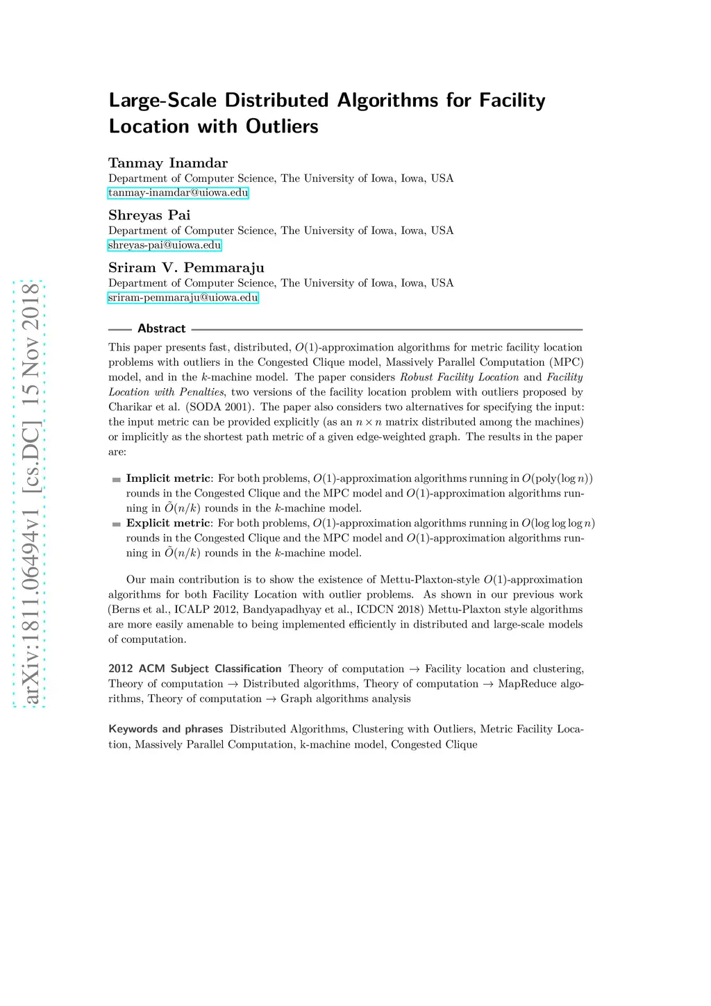 This paper presents fast, distributed, -approximation algorithms for metric facility location problems with outliers in the Congested Clique model, Massively Parallel Computation (MPC) model, and in the -machine model. The paper considers Robust Facility Location and Facility Location with Penalties, two versions of the facility location problem with outliers proposed by Charikar et al. (SODA 2001). The paper also considers two alternatives for specifying the input: the input metric can be provided explicitly (as an matrix distributed among the machines) or implicitly as the shortest path metric of a given edge-weighted graph. The results in the paper are: - Implicit metric: For both problems, -approximation algorithms running in rounds in the Congested Clique and the MPC model and -approximation algorithms running in rounds in the -machine model. - Explicit metric: For both problems, -approximation algorithms running in rounds in the Congested Clique and the MPC model and -approximation algorithms running in rounds in the -machine model. Our main contribution is to show the existence of Mettu-Plaxton-style -approximation algorithms for both Facility Location with outlier problems. As shown in our previous work (Berns et al., ICALP 2012, Bandyapadhyay et al., ICDCN 2018) Mettu-Plaxton style algorithms are more easily amenable to being implemented efficiently in distributed and large-scale models of computation.