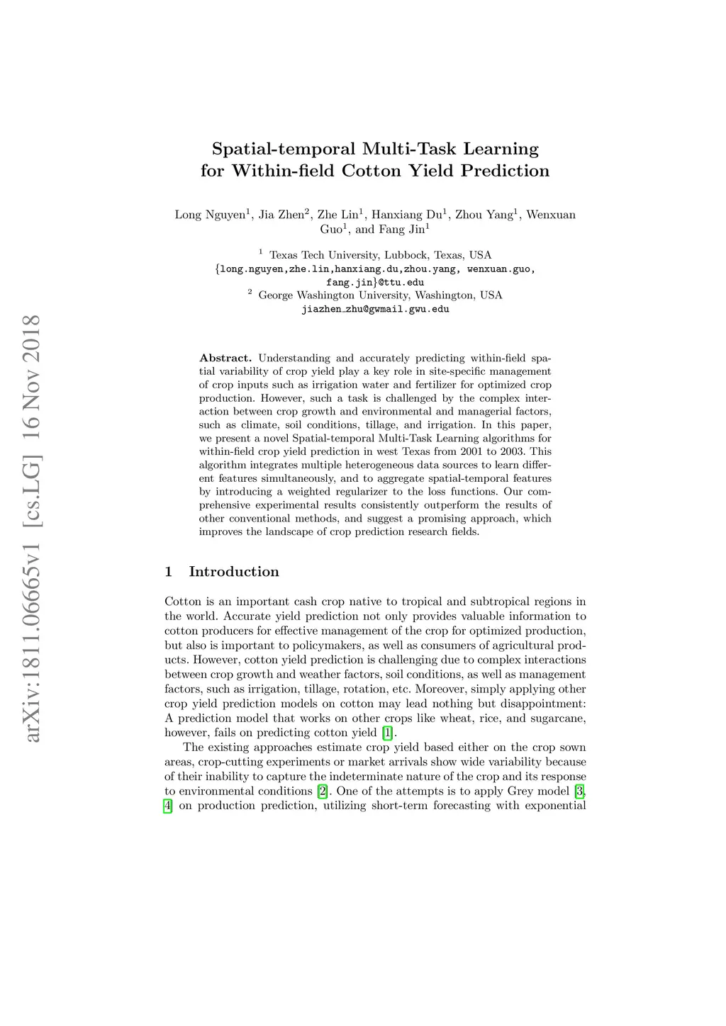 Understanding and accurately predicting within-field spatial variability of crop yield play a key role in site-specific management of crop inputs such as irrigation water and fertilizer for optimized crop production. However, such a task is challenged by the complex interaction between crop growth and environmental and managerial factors, such as climate, soil conditions, tillage, and irrigation. In this paper, we present a novel Spatial-temporal Multi-Task Learning algorithms for within-field crop yield prediction in west Texas from 2001 to 2003. This algorithm integrates multiple heterogeneous data sources to learn different features simultaneously, and to aggregate spatial-temporal features by introducing a weighted regularizer to the loss functions. Our comprehensive experimental results consistently outperform the results of other conventional methods, and suggest a promising approach, which improves the landscape of crop prediction research fields.