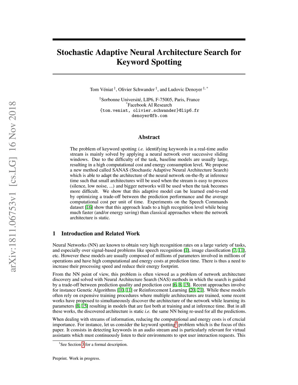 The problem of keyword spotting i.e. identifying keywords in a real-time audio stream is mainly solved by applying a neural network over successive sliding windows. Due to the difficulty of the task, baseline models are usually large, resulting in a high computational cost and energy consumption level. We propose a new method called SANAS (Stochastic Adaptive Neural Architecture Search) which is able to adapt the architecture of the neural network on-the-fly at inference time such that small architectures will be used when the stream is easy to process (silence, low noise, ...) and bigger networks will be used when the task becomes more difficult. We show that this adaptive model can be learned end-to-end by optimizing a trade-off between the prediction performance and the average computational cost per unit of time. Experiments on the Speech Commands dataset show that this approach leads to a high recognition level while being much faster (and/or energy saving) than classical approaches where the network architecture is static.
