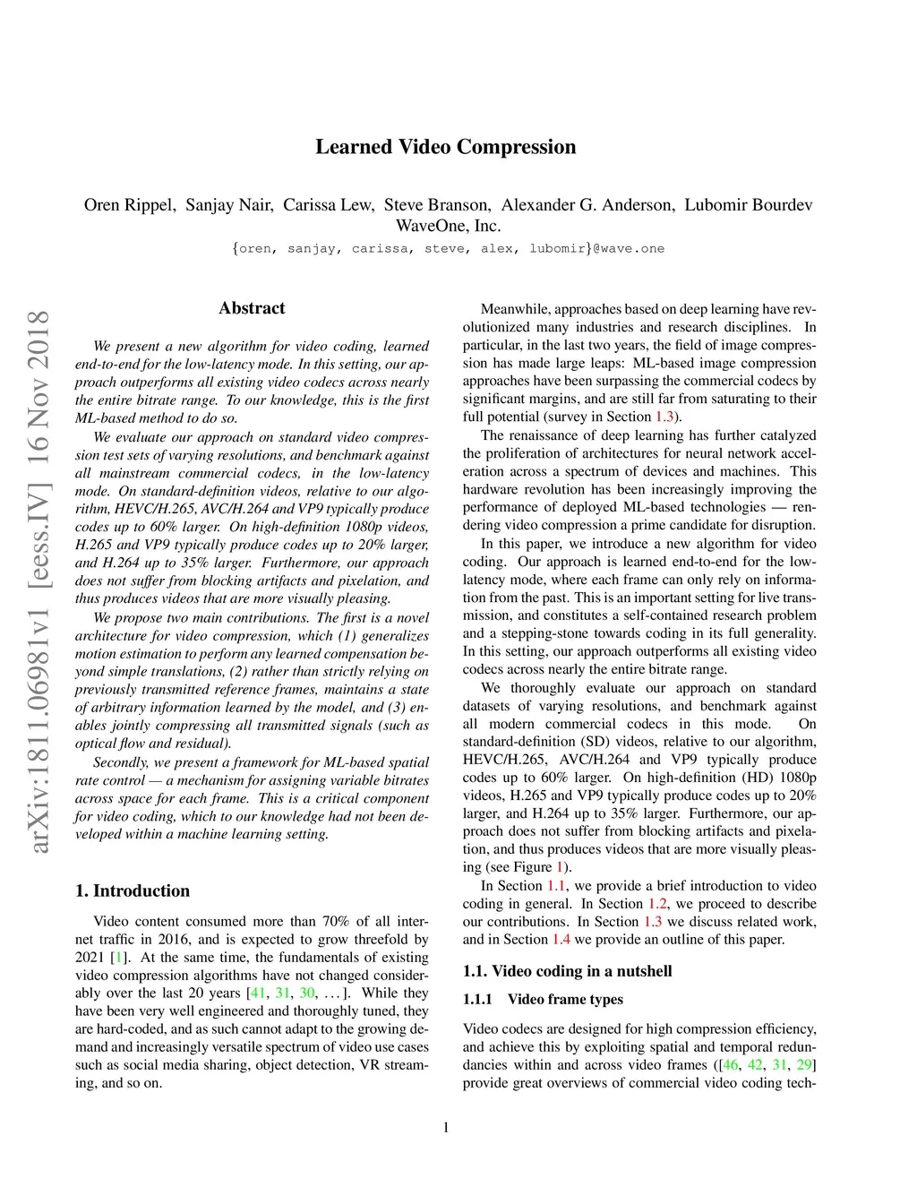 We present a new algorithm for video coding, learned end-to-end for the low-latency mode. In this setting, our approach outperforms all existing video codecs across nearly the entire bitrate range. To our knowledge, this is the first ML-based method to do so. We evaluate our approach on standard video compression test sets of varying resolutions, and benchmark against all mainstream commercial codecs, in the low-latency mode. On standard-definition videos, relative to our algorithm, HEVC/H.265, AVC/H.264 and VP9 typically produce codes up to 60% larger. On high-definition 1080p videos, H.265 and VP9 typically produce codes up to 20% larger, and H.264 up to 35% larger. Furthermore, our approach does not suffer from blocking artifacts and pixelation, and thus produces videos that are more visually pleasing. We propose two main contributions. The first is a novel architecture for video compression, which (1) generalizes motion estimation to perform any learned compensation beyond simple translations, (2) rather than strictly relying on previously transmitted reference frames, maintains a state of arbitrary information learned by the model, and (3) enables jointly compressing all transmitted signals (such as optical flow and residual). Secondly, we present a framework for ML-based spatial rate control: namely, a mechanism for assigning variable bitrates across space for each frame. This is a critical component for video coding, which to our knowledge had not been developed within a machine learning setting.