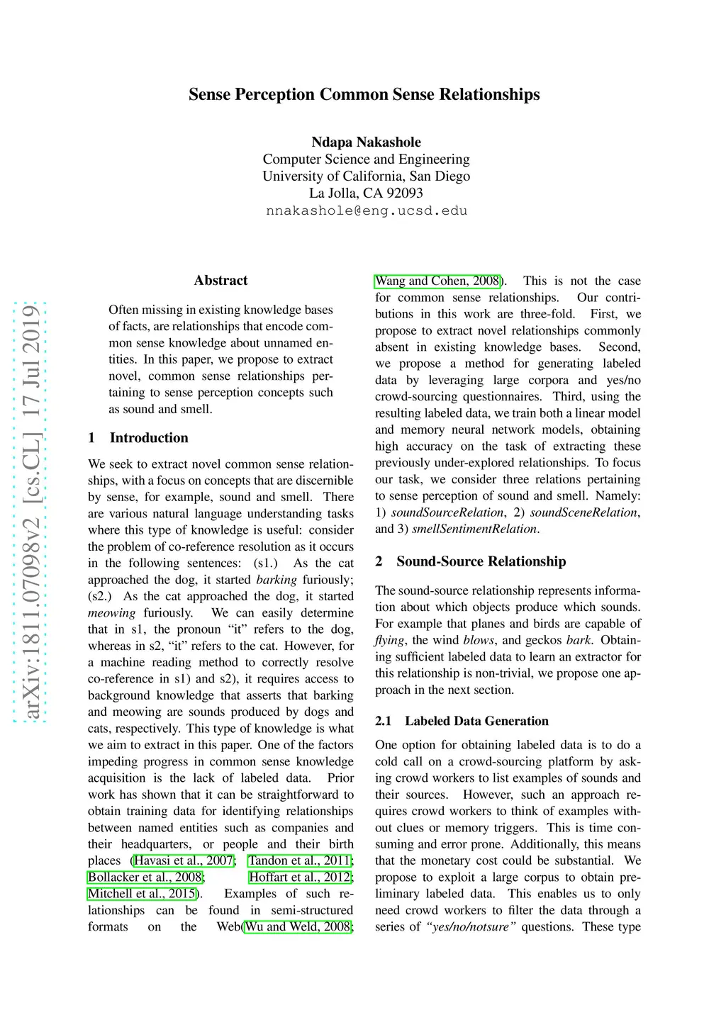 Often missing in existing knowledge bases of facts, are relationships that encode common sense knowledge about unnamed entities. In this paper, we propose to extract novel, common sense relationships pertaining to sense perception concepts such as sound and smell.