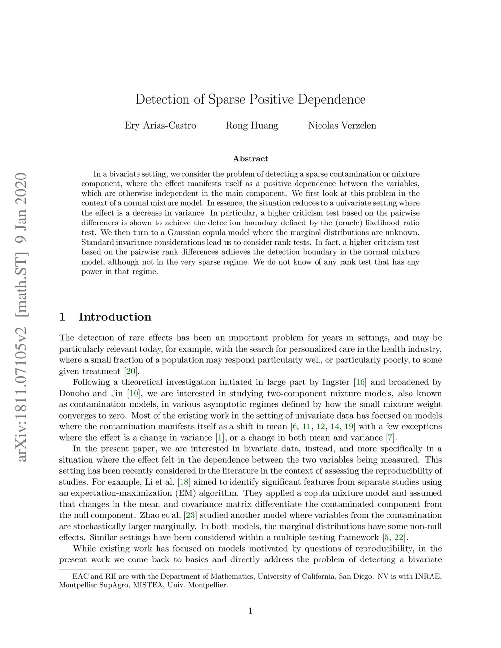 In a bivariate setting, we consider the problem of detecting a sparse contamination or mixture component, where the effect manifests itself as a positive dependence between the variables, which are otherwise independent in the main component. We first look at this problem in the context of a normal mixture model. In essence, the situation reduces to a univariate setting where the effect is a decrease in variance. In particular, a higher criticism test based on the pairwise differences is shown to achieve the detection boundary defined by the (oracle) likelihood ratio test. We then turn to a Gaussian copula model where the marginal distributions are unknown. Standard invariance considerations lead us to consider rank tests. In fact, a higher criticism test based on the pairwise rank differences achieves the detection boundary in the normal mixture model, although not in the very sparse regime. We do not know of any rank test that has any power in that regime.