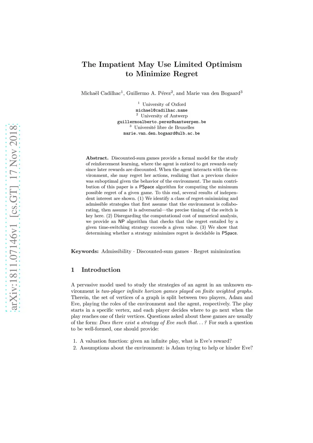 Discounted-sum games provide a formal model for the study of reinforcement learning, where the agent is enticed to get rewards early since later rewards are discounted. When the agent interacts with the environment, she may regret her actions, realizing that a previous choice was suboptimal given the behavior of the environment. The main contribution of this paper is a PSPACE algorithm for computing the minimum possible regret of a given game. To this end, several results of independent interest are shown. (1) We identify a class of regret-minimizing and admissible strategies that first assume that the environment is collaborating, then assume it is adversarial---the precise timing of the switch is key here. (2) Disregarding the computational cost of numerical analysis, we provide an NP algorithm that checks that the regret entailed by a given time-switching strategy exceeds a given value. (3) We show that determining whether a strategy minimizes regret is decidable in PSPACE.