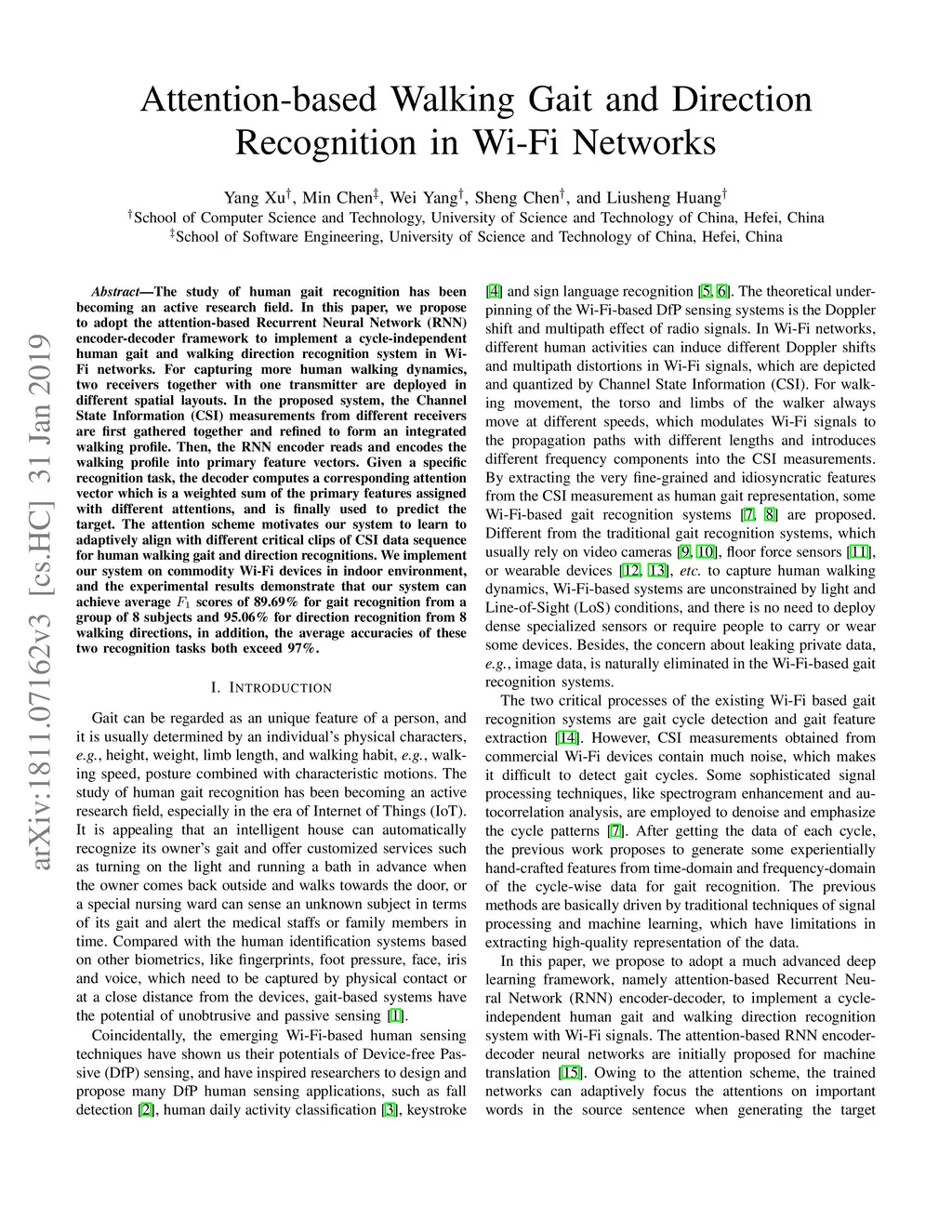 The study of human gait recognition has been becoming an active research field. In this paper, we propose to adopt the attention-based Recurrent Neural Network (RNN) encoder-decoder framework to implement a cycle-independent human gait and walking direction recognition system in Wi-Fi networks. For capturing more human walking dynamics, two receivers together with one transmitter are deployed in different spatial layouts. In the proposed system, the Channel State Information (CSI) measurements from different receivers are first gathered together and refined to form an integrated walking profile. Then, the RNN encoder reads and encodes the walking profile into primary feature vectors. Given a specific recognition task, the decoder computes a corresponding attention vector which is a weighted sum of the primary features assigned with different attentions, and is finally used to predict the target. The attention scheme motivates our system to learn to adaptively align with different critical clips of CSI data sequence for human walking gait and direction recognitions. We implement our system on commodity Wi-Fi devices in indoor environment, and the experimental results demonstrate that the proposed model can achieve promising average F1 scores of 95.35% for gait recognition from a group of 11 subjects and 96.92% for direction recognition from 8 walking directions.