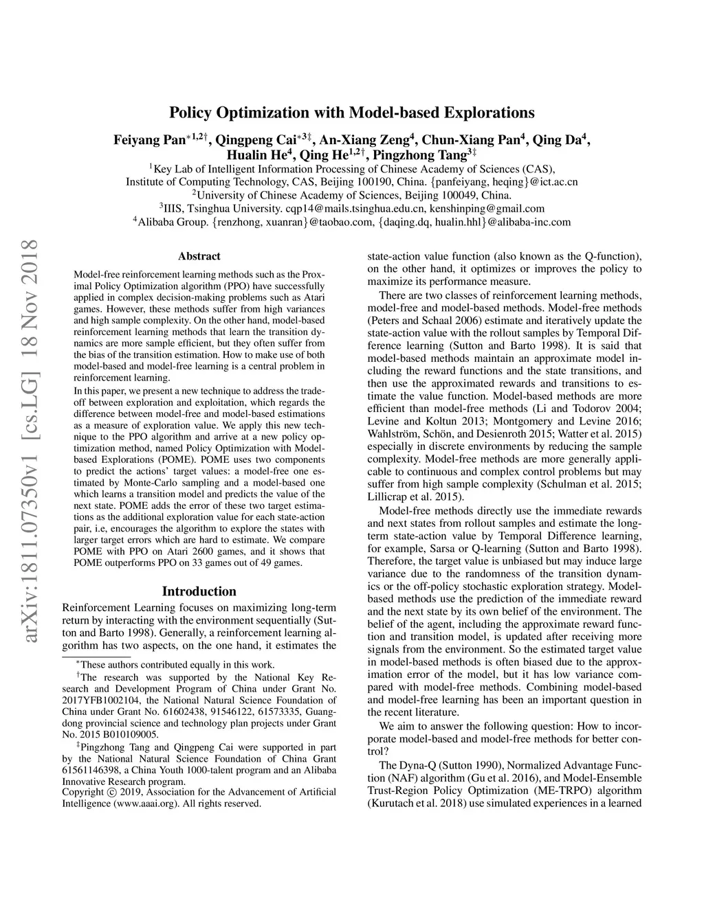 Model-free reinforcement learning methods such as the Proximal Policy Optimization algorithm (PPO) have successfully applied in complex decision-making problems such as Atari games. However, these methods suffer from high variances and high sample complexity. On the other hand, model-based reinforcement learning methods that learn the transition dynamics are more sample efficient, but they often suffer from the bias of the transition estimation. How to make use of both model-based and model-free learning is a central problem in reinforcement learning. In this paper, we present a new technique to address the trade-off between exploration and exploitation, which regards the difference between model-free and model-based estimations as a measure of exploration value. We apply this new technique to the PPO algorithm and arrive at a new policy optimization method, named Policy Optimization with Model-based Explorations (POME). POME uses two components to predict the actions' target values: a model-free one estimated by Monte-Carlo sampling and a model-based one which learns a transition model and predicts the value of the next state. POME adds the error of these two target estimations as the additional exploration value for each state-action pair, i.e, encourages the algorithm to explore the states with larger target errors which are hard to estimate. We compare POME with PPO on Atari 2600 games, and it shows that POME outperforms PPO on 33 games out of 49 games.