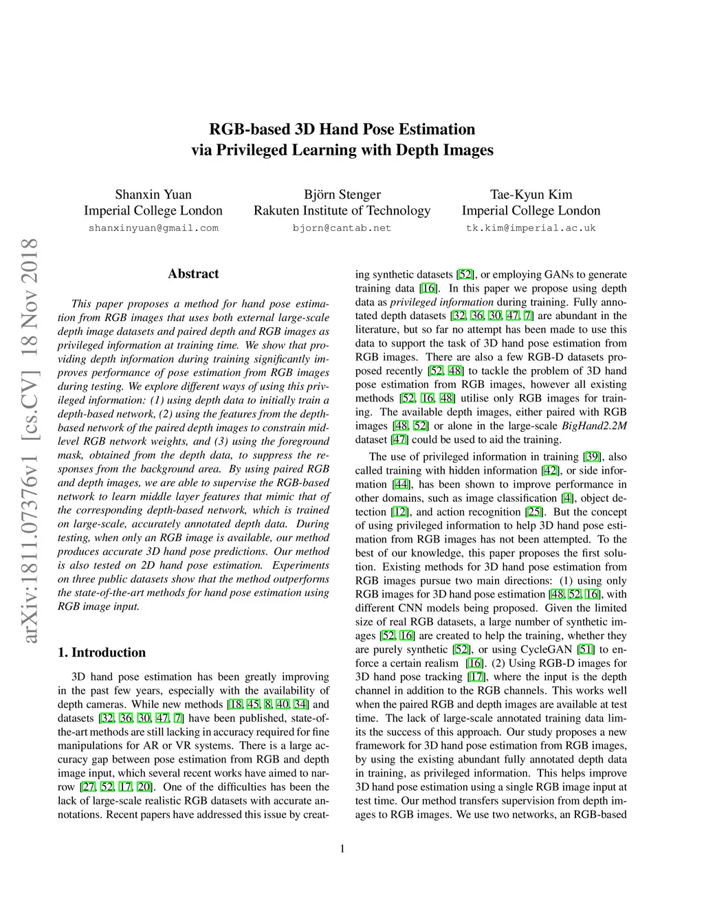 RGB-based 3D Hand Pose Estimation via Privileged Learning with Depth