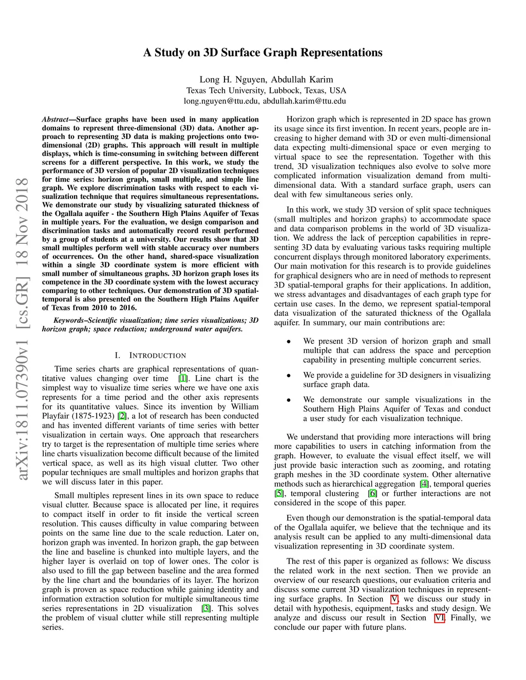 Surface graphs have been used in many application domains to represent three-dimensional (3D) data. Another approach to representing 3D data is making projections onto two-dimensional (2D) graphs. This approach will result in multiple displays, which is time-consuming in switching between different screens for a different perspective. In this work, we study the performance of 3D version of popular 2D visualization techniques for time series: horizon graph, small multiple, and simple line graph. We explore discrimination tasks with respect to each visualization technique that requires simultaneous representations. We demonstrate our study by visualizing saturated thickness of the Ogallala aquifer - the Southern High Plains Aquifer of Texas in multiple years. For the evaluation, we design comparison and discrimination tasks and automatically record result performed by a group of students at a university. Our results show that 3D small multiples perform well with stable accuracy over numbers of occurrences. On the other hand, shared-space visualization within a single 3D coordinate system is more efficient with small number of simultaneous graphs. 3D horizon graph loses its competence in the 3D coordinate system with the lowest accuracy comparing to other techniques. Our demonstration of 3D spatial-temporal is also presented on the Southern High Plains Aquifer of Texas from 2010 to 2016.
