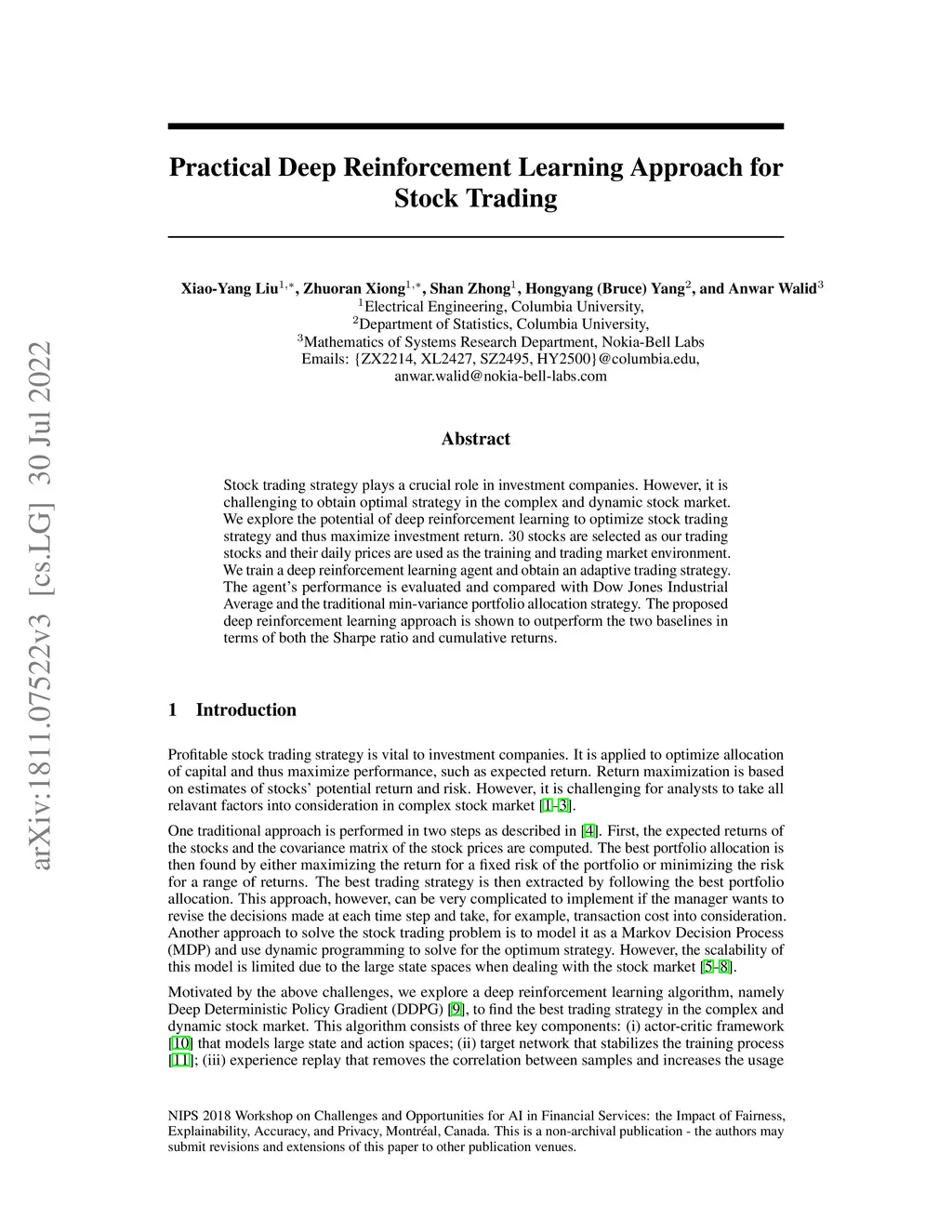 Practical Deep Reinforcement Learning Approach for Stock Trading