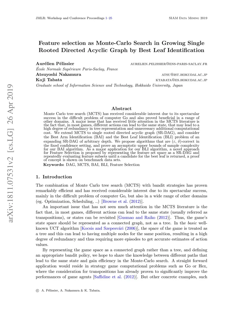 Monte Carlo tree search (MCTS) has received considerable interest due to its spectacular success in the difficult problem of computer Go and also proved beneficial in a range of other domains. A major issue that has received little attention in the MCTS literature is the fact that, in most games, different actions can lead to the same state, that may lead to a high degree of redundancy in tree representation and unnecessary additional computational cost. We extend MCTS to single rooted directed acyclic graph (SR-DAG), and consider the Best Arm Identification (BAI) and the Best Leaf Identification (BLI) problem of an expanding SR-DAG of arbitrary depth. We propose algorithms that are (epsilon, delta)-correct in the fixed confidence setting, and prove an asymptotic upper bounds of sample complexity for our BAI algorithm. As a major application for our BLI algorithm, a novel approach for Feature Selection is proposed by representing the feature set space as a SR-DAG and repeatedly evaluating feature subsets until a candidate for the best leaf is returned, a proof of concept is shown on benchmark data sets.