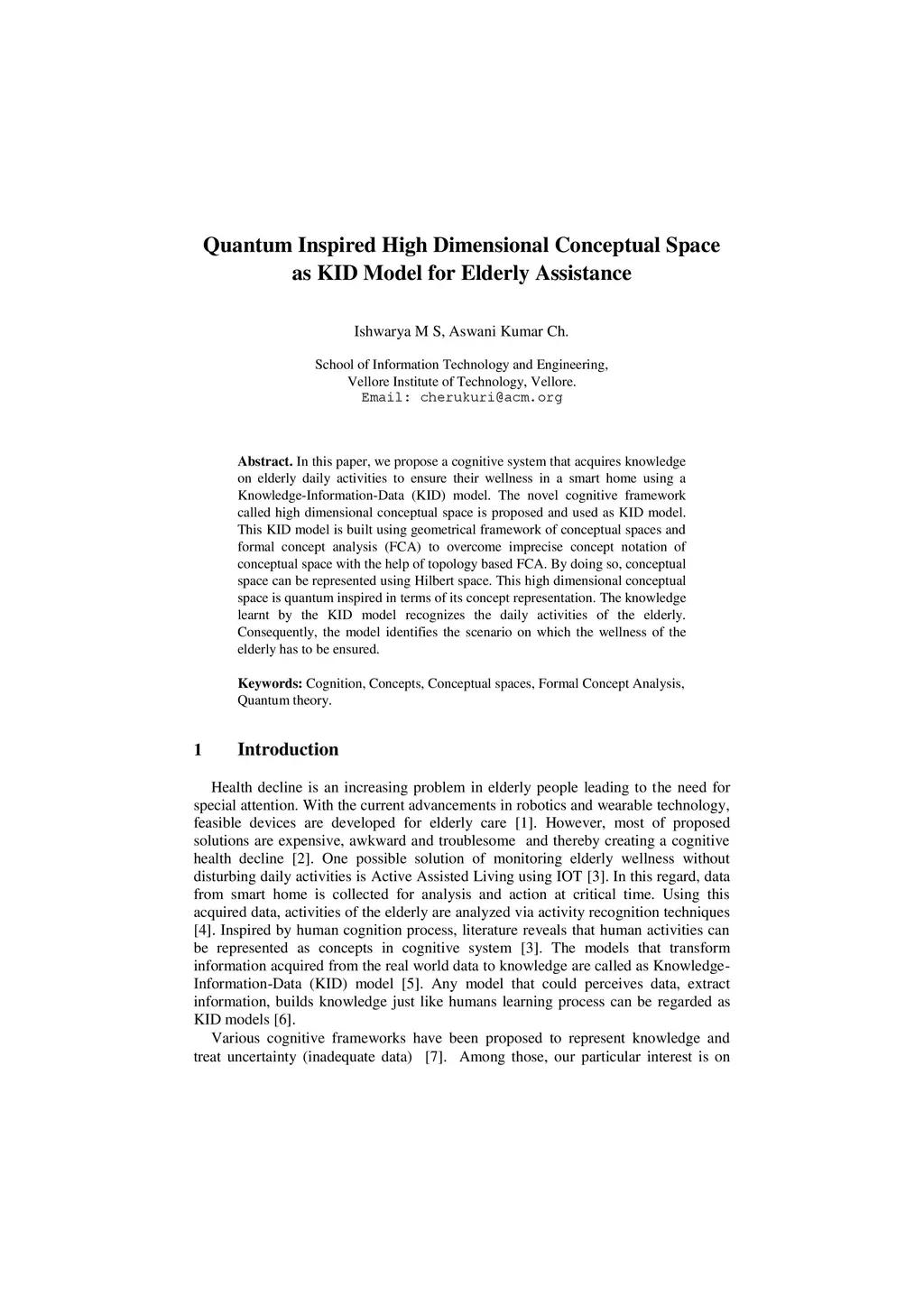 In this paper, we propose a cognitive system that acquires knowledge on elderly daily activities to ensure their wellness in a smart home using a Knowledge-Information-Data (KID) model. The novel cognitive framework called high dimensional conceptual space is proposed and used as KID model. This KID model is built using geometrical framework of conceptual spaces and formal concept analysis (FCA) to overcome imprecise concept notation of conceptual space with the help of topology based FCA. By doing so, conceptual space can be represented using Hilbert space. This high dimensional conceptual space is quantum inspired in terms of its concept representation. The knowledge learnt by the KID model recognizes the daily activities of the elderly. Consequently, the model identifies the scenario on which the wellness of the elderly has to be ensured.