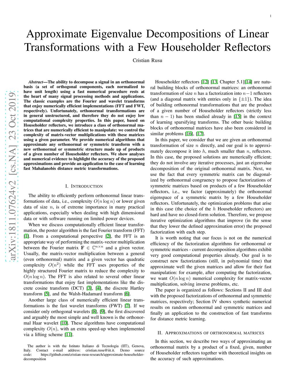 The ability to decompose a signal in an orthonormal basis (a set of orthogonal components, each normalized to have unit length) using a fast numerical procedure rests at the heart of many signal processing methods and applications. The classic examples are the Fourier and wavelet transforms that enjoy numerically efficient implementations (FFT and FWT, respectively). Unfortunately, orthonormal transformations are in general unstructured, and therefore they do not enjoy low computational complexity properties. In this paper, based on Householder reflectors, we introduce a class of orthonormal matrices that are numerically efficient to manipulate: we control the complexity of matrix-vector multiplications with these matrices using a given parameter. We provide numerical algorithms that approximate any orthonormal or symmetric transform with a new orthonormal or symmetric structure made up of products of a given number of Householder reflectors. We show analyses and numerical evidence to highlight the accuracy of the proposed approximations and provide an application to the case of learning fast Mahanalobis distance metric transformations.