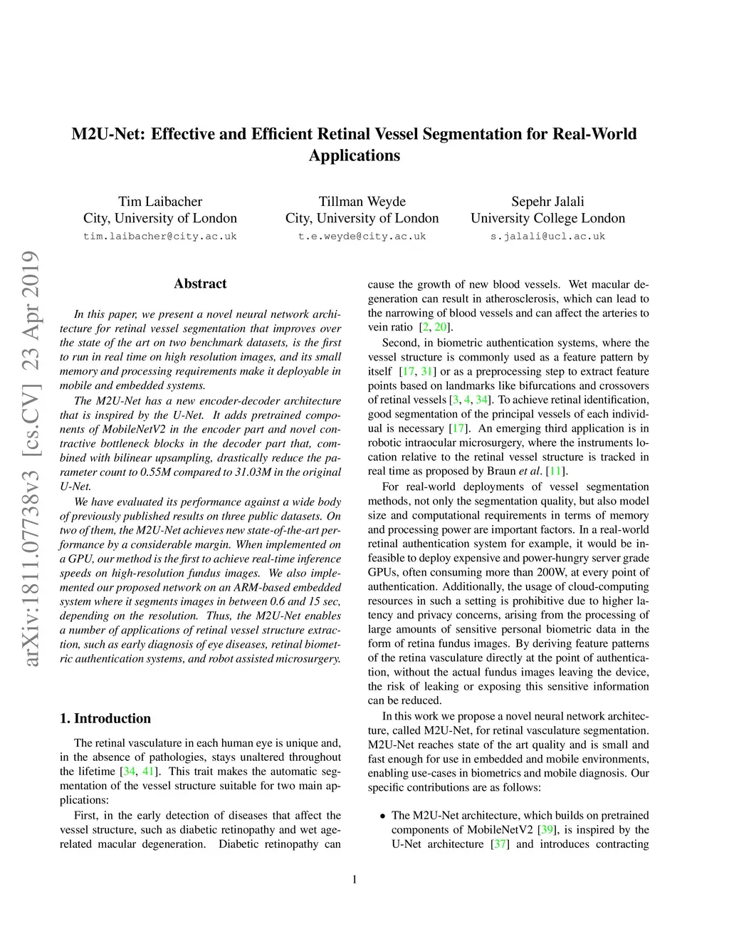 In this paper, we present a novel neural network architecture for retinal vessel segmentation that improves over the state of the art on two benchmark datasets, is the first to run in real time on high resolution images, and its small memory and processing requirements make it deployable in mobile and embedded systems. The M2U-Net has a new encoder-decoder architecture that is inspired by the U-Net. It adds pretrained components of MobileNetV2 in the encoder part and novel contractive bottleneck blocks in the decoder part that, combined with bilinear upsampling, drastically reduce the parameter count to 0.55M compared to 31.03M in the original U-Net. We have evaluated its performance against a wide body of previously published results on three public datasets. On two of them, the M2U-Net achieves new state-of-the-art performance by a considerable margin. When implemented on a GPU, our method is the first to achieve real-time inference speeds on high-resolution fundus images. We also implemented our proposed network on an ARM-based embedded system where it segments images in between 0.6 and 15 sec, depending on the resolution. Thus, the M2U-Net enables a number of applications of retinal vessel structure extraction, such as early diagnosis of eye diseases, retinal biometric authentication systems, and robot assisted microsurgery.