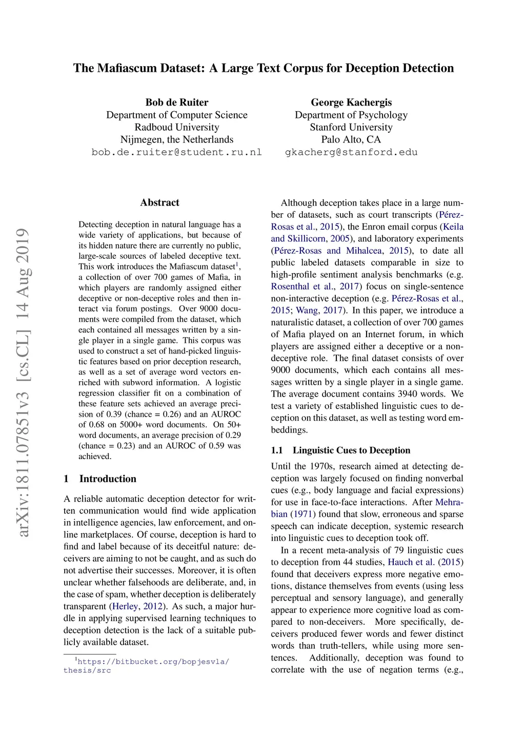 The Mafiascum Dataset: A Large Text Corpus for Deception Detection