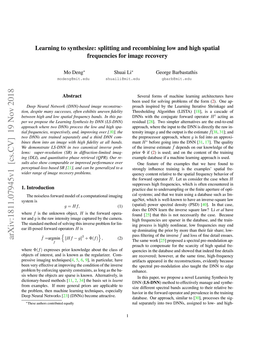 Deep Neural Network (DNN)-based image reconstruction, despite many successes, often exhibits uneven fidelity between high and low spatial frequency bands. In this paper we propose the Learning Synthesis by DNN (LS-DNN) approach where two DNNs process the low and high spatial frequencies, respectively, and, improving over [30], the two DNNs are trained separately and a third DNN combines them into an image with high fidelity at all bands. We demonstrate LS-DNN in two canonical inverse problems: super-resolution (SR) in diffraction-limited imaging (DLI), and quantitative phase retrieval (QPR). Our results also show comparable or improved performance over perceptual-loss based SR [21], and can be generalized to a wider range of image recovery problems.