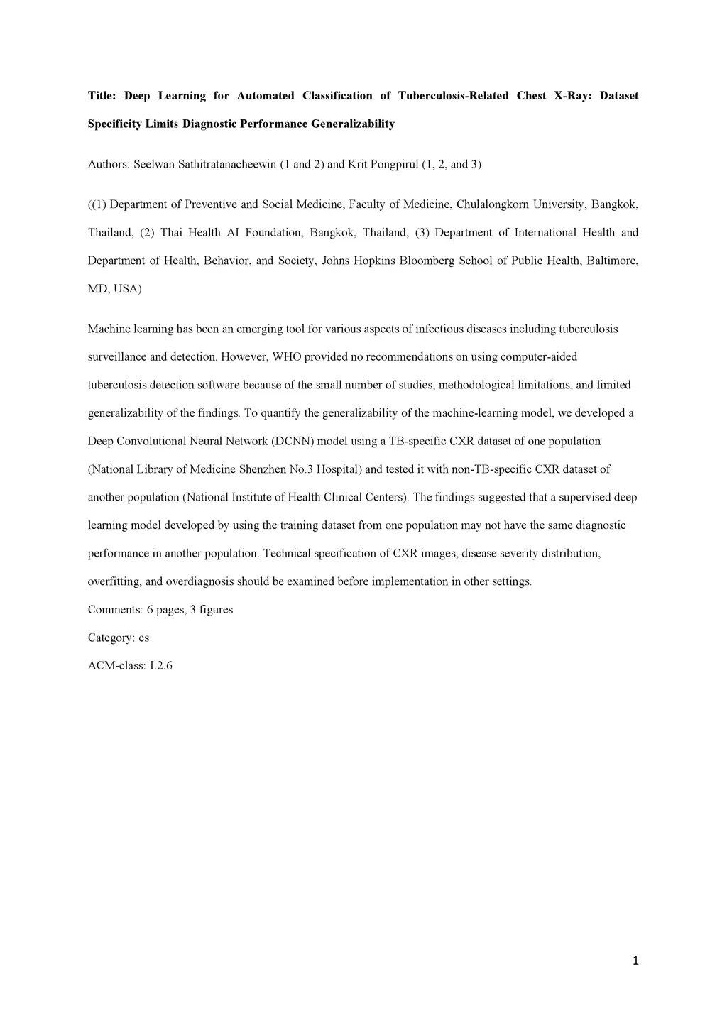 Machine learning has been an emerging tool for various aspects of infectious diseases including tuberculosis surveillance and detection. However, WHO provided no recommendations on using computer-aided tuberculosis detection software because of the small number of studies, methodological limitations, and limited generalizability of the findings. To quantify the generalizability of the machine-learning model, we developed a Deep Convolutional Neural Network (DCNN) model using a TB-specific CXR dataset of one population (National Library of Medicine Shenzhen No.3 Hospital) and tested it with non-TB-specific CXR dataset of another population (National Institute of Health Clinical Centers). The findings suggested that a supervised deep learning model developed by using the training dataset from one population may not have the same diagnostic performance in another population. Technical specification of CXR images, disease severity distribution, overfitting, and overdiagnosis should be examined before implementation in other settings.