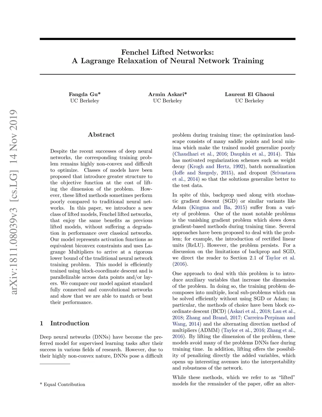 Despite the recent successes of deep neural networks, the corresponding training problem remains highly non-convex and difficult to optimize. Classes of models have been proposed that introduce greater structure to the objective function at the cost of lifting the dimension of the problem. However, these lifted methods sometimes perform poorly compared to traditional neural networks. In this paper, we introduce a new class of lifted models, Fenchel lifted networks, that enjoy the same benefits as previous lifted models, without suffering a degradation in performance over classical networks. Our model represents activation functions as equivalent biconvex constraints and uses Lagrange Multipliers to arrive at a rigorous lower bound of the traditional neural network training problem. This model is efficiently trained using block-coordinate descent and is parallelizable across data points and/or layers. We compare our model against standard fully connected and convolutional networks and show that we are able to match or beat their performance.