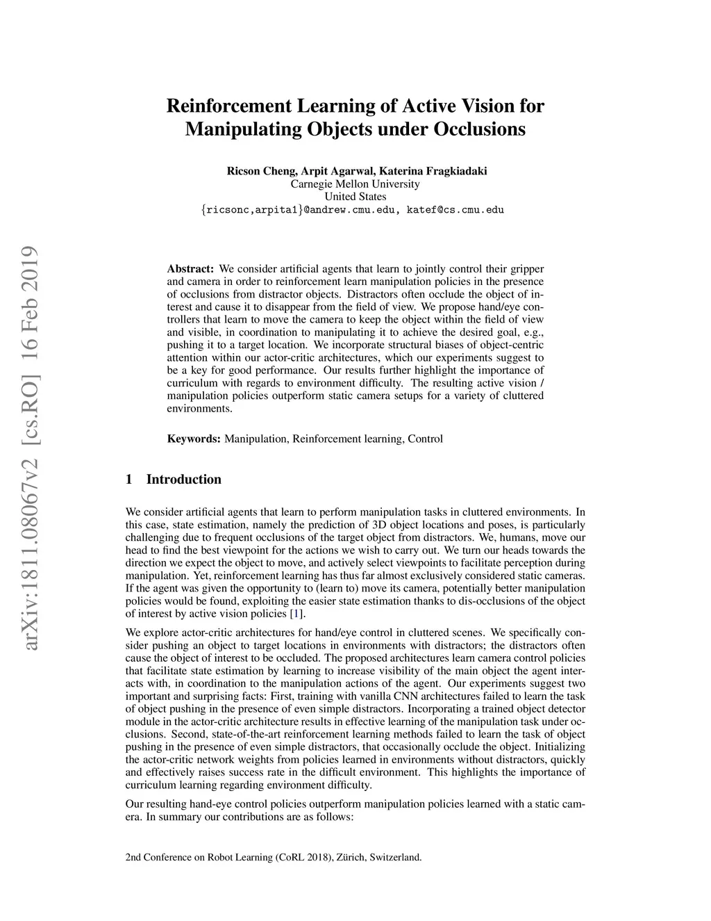 We consider artificial agents that learn to jointly control their gripperand camera in order to reinforcement learn manipulation policies in the presenceof occlusions from distractor objects. Distractors often occlude the object of in-terest and cause it to disappear from the field of view. We propose hand/eye con-trollers that learn to move the camera to keep the object within the field of viewand visible, in coordination to manipulating it to achieve the desired goal, e.g.,pushing it to a target location. We incorporate structural biases of object-centricattention within our actor-critic architectures, which our experiments suggest tobe a key for good performance. Our results further highlight the importance ofcurriculum with regards to environment difficulty. The resulting active vision /manipulation policies outperform static camera setups for a variety of clutteredenvironments.