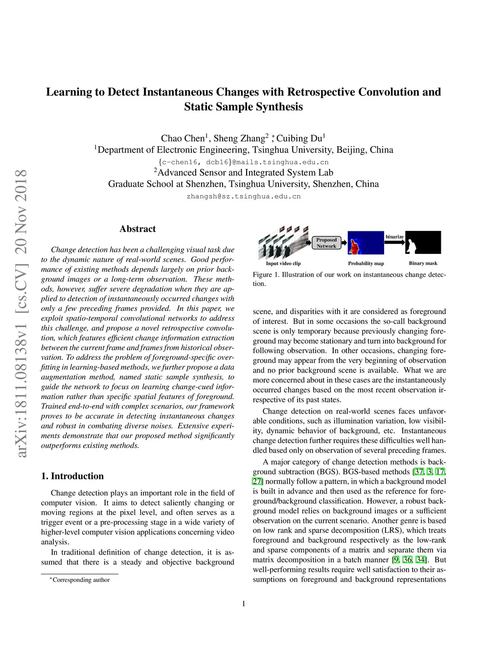 Change detection has been a challenging visual task due to the dynamic nature of real-world scenes. Good performance of existing methods depends largely on prior background images or a long-term observation. These methods, however, suffer severe degradation when they are applied to detection of instantaneously occurred changes with only a few preceding frames provided. In this paper, we exploit spatio-temporal convolutional networks to address this challenge, and propose a novel retrospective convolution, which features efficient change information extraction between the current frame and frames from historical observation. To address the problem of foreground-specific over-fitting in learning-based methods, we further propose a data augmentation method, named static sample synthesis, to guide the network to focus on learning change-cued information rather than specific spatial features of foreground. Trained end-to-end with complex scenarios, our framework proves to be accurate in detecting instantaneous changes and robust in combating diverse noises. Extensive experiments demonstrate that our proposed method significantly outperforms existing methods.