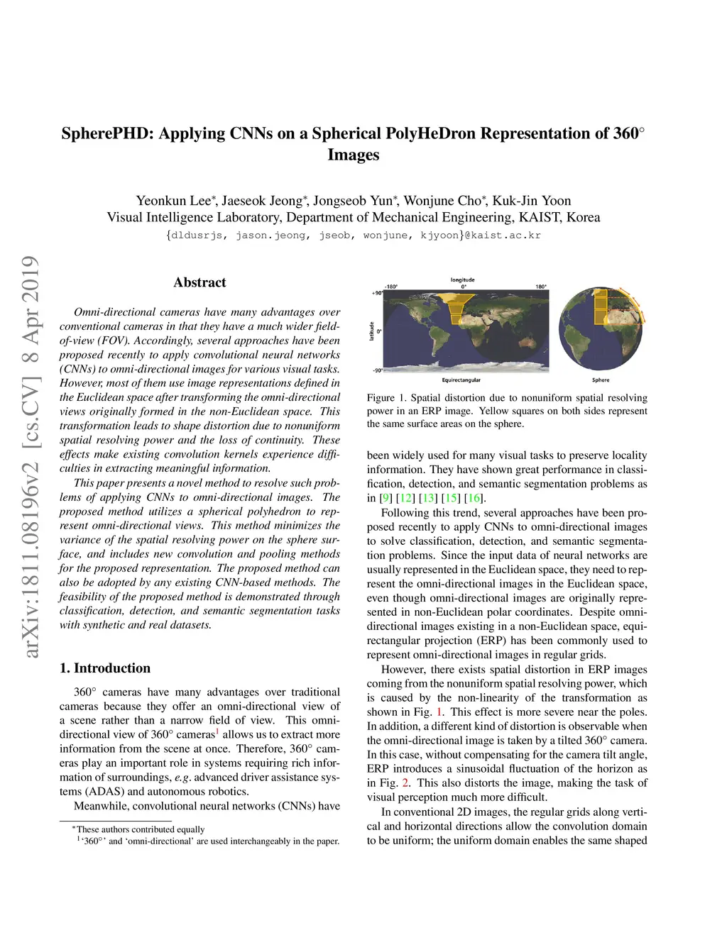 Omni-directional cameras have many advantages overconventional cameras in that they have a much wider field-of-view (FOV). Accordingly, several approaches have beenproposed recently to apply convolutional neural networks(CNNs) to omni-directional images for various visual tasks.However, most of them use image representations defined inthe Euclidean space after transforming the omni-directionalviews originally formed in the non-Euclidean space. Thistransformation leads to shape distortion due to nonuniformspatial resolving power and the loss of continuity. Theseeffects make existing convolution kernels experience diffi-culties in extracting meaningful information.This paper presents a novel method to resolve such prob-lems of applying CNNs to omni-directional images. Theproposed method utilizes a spherical polyhedron to rep-resent omni-directional views. This method minimizes thevariance of the spatial resolving power on the sphere sur-face, and includes new convolution and pooling methodsfor the proposed representation. The proposed method canalso be adopted by any existing CNN-based methods. Thefeasibility of the proposed method is demonstrated throughclassification, detection, and semantic segmentation taskswith synthetic and real datasets.
