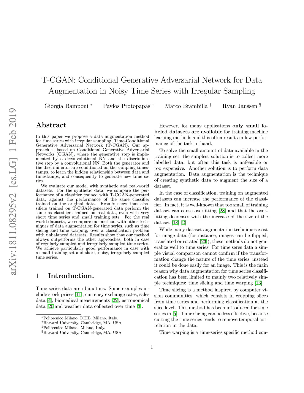 In this paper we propose a data augmentation method for time series with irregular sampling, Time-Conditional Generative Adversarial Network (T-CGAN). Our approach is based on Conditional Generative Adversarial Networks (CGAN), where the generative step is implemented by a deconvolutional NN and the discriminative step by a convolutional NN. Both the generator and the discriminator are conditioned on the sampling timestamps, to learn the hidden relationship between data and timestamps, and consequently to generate new time series. We evaluate our model with synthetic and real-world datasets. For the synthetic data, we compare the performance of a classifier trained with T-CGAN-generated data, against the performance of the same classifier trained on the original data. Results show that classifiers trained on T-CGAN-generated data perform the same as classifiers trained on real data, even with very short time series and small training sets. For the real world datasets, we compare our method with other techniques of data augmentation for time series, such as time slicing and time warping, over a classification problem with unbalanced datasets. Results show that our method always outperforms the other approaches, both in case of regularly sampled and irregularly sampled time series. We achieve particularly good performance in case with a small training set and short, noisy, irregularly-sampled time series.