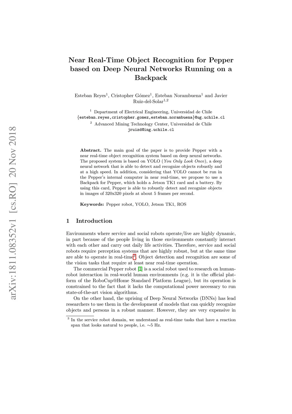 Near Real-Time Object Recognition for Pepper based on Deep Neural