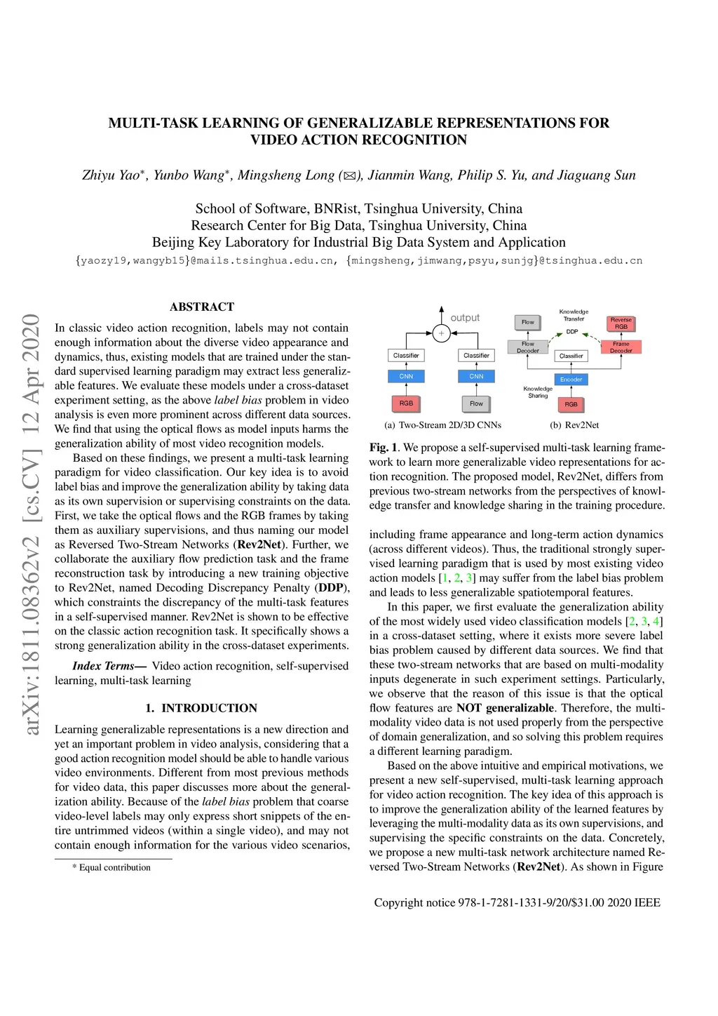In classic video action recognition, labels may not contain enough information about the diverse video appearance and dynamics, thus, existing models that are trained under the standard supervised learning paradigm may extract less generalizable features. We evaluate these models under a cross-dataset experiment setting, as the above label bias problem in video analysis is even more prominent across different data sources. We find that using the optical flows as model inputs harms the generalization ability of most video recognition models. Based on these findings, we present a multi-task learning paradigm for video classification. Our key idea is to avoid label bias and improve the generalization ability by taking data as its own supervision or supervising constraints on the data. First, we take the optical flows and the RGB frames by taking them as auxiliary supervisions, and thus naming our model as Reversed Two-Stream Networks (Rev2Net). Further, we collaborate the auxiliary flow prediction task and the frame reconstruction task by introducing a new training objective to Rev2Net, named Decoding Discrepancy Penalty (DDP), which constraints the discrepancy of the multi-task features in a self-supervised manner. Rev2Net is shown to be effective on the classic action recognition task. It specifically shows a strong generalization ability in the cross-dataset experiments.