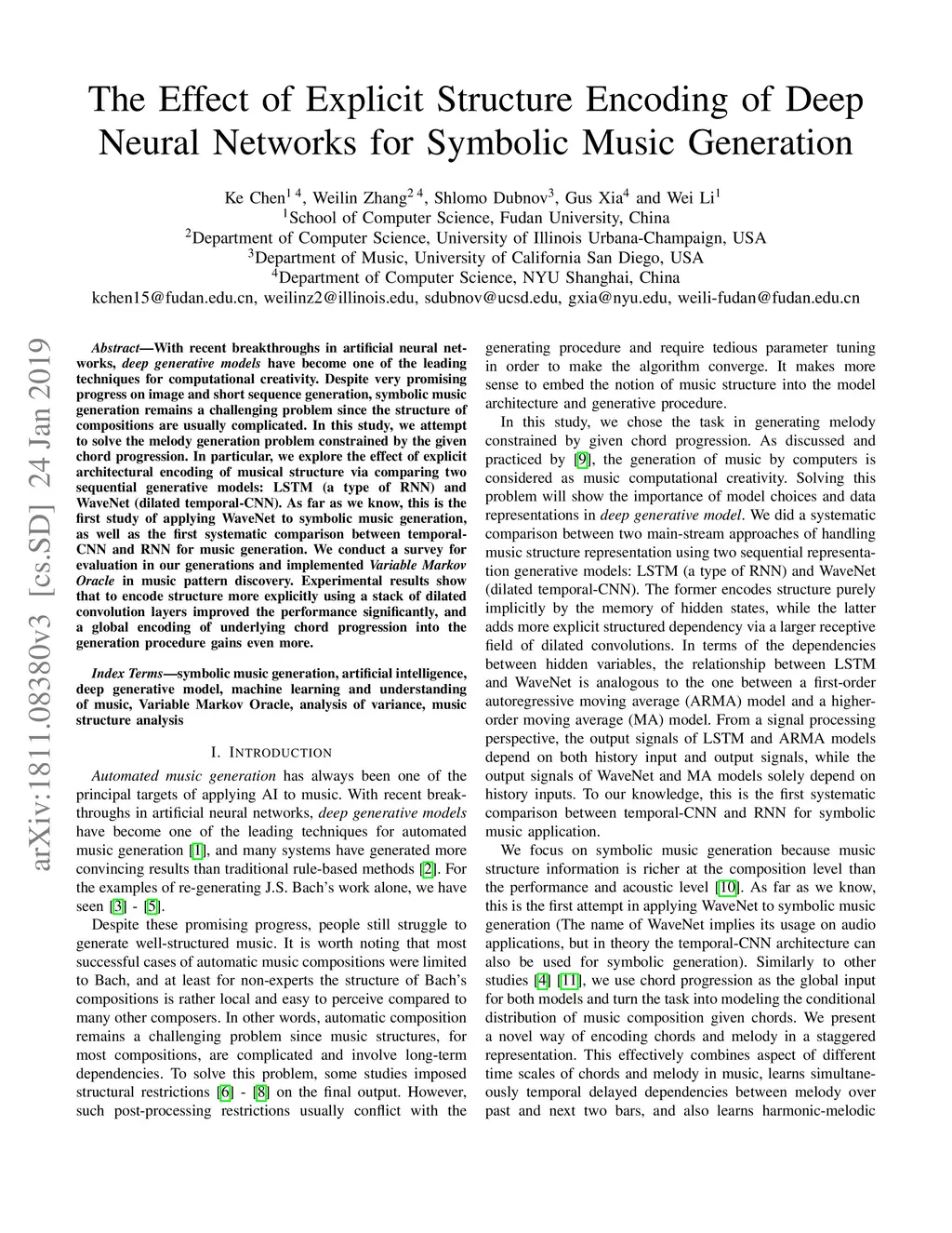 With recent breakthroughs in artificial neural networks, deep generative models have become one of the leading techniques for computational creativity. Despite very promising progress on image and short sequence generation, symbolic music generation remains a challenging problem since the structure of compositions are usually complicated. In this study, we attempt to solve the melody generation problem constrained by the given chord progression. This music meta-creation problem can also be incorporated into a plan recognition system with user inputs and predictive structural outputs. In particular, we explore the effect of explicit architectural encoding of musical structure via comparing two sequential generative models: LSTM (a type of RNN) and WaveNet (dilated temporal-CNN). As far as we know, this is the first study of applying WaveNet to symbolic music generation, as well as the first systematic comparison between temporal-CNN and RNN for music generation. We conduct a survey for evaluation in our generations and implemented Variable Markov Oracle in music pattern discovery. Experimental results show that to encode structure more explicitly using a stack of dilated convolution layers improved the performance significantly, and a global encoding of underlying chord progression into the generation procedure gains even more.