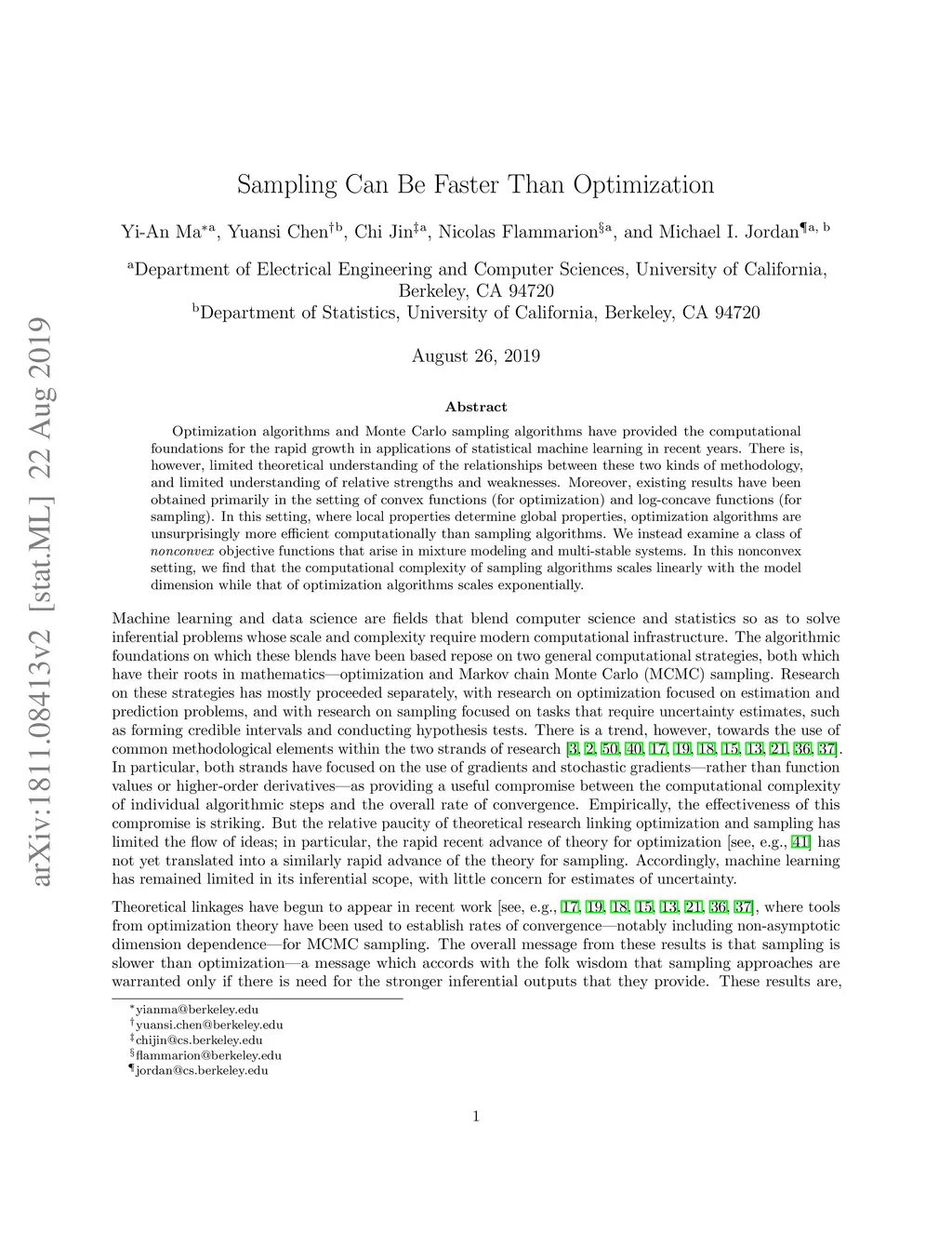 Optimization algorithms and Monte Carlo sampling algorithms have provided the computational foundations for the rapid growth in applications of statistical machine learning in recent years. There is, however, limited theoretical understanding of the relationships between these two kinds of methodology, and limited understanding of relative strengths and weaknesses. Moreover, existing results have been obtained primarily in the setting of convex functions (for optimization) and log-concave functions (for sampling). In this setting, where local properties determine global properties, optimization algorithms are unsurprisingly more efficient computationally than sampling algorithms. We instead examine a class of nonconvex objective functions that arise in mixture modeling and multi-stable systems. In this nonconvex setting, we find that the computational complexity of sampling algorithms scales linearly with the model dimension while that of optimization algorithms scales exponentially.