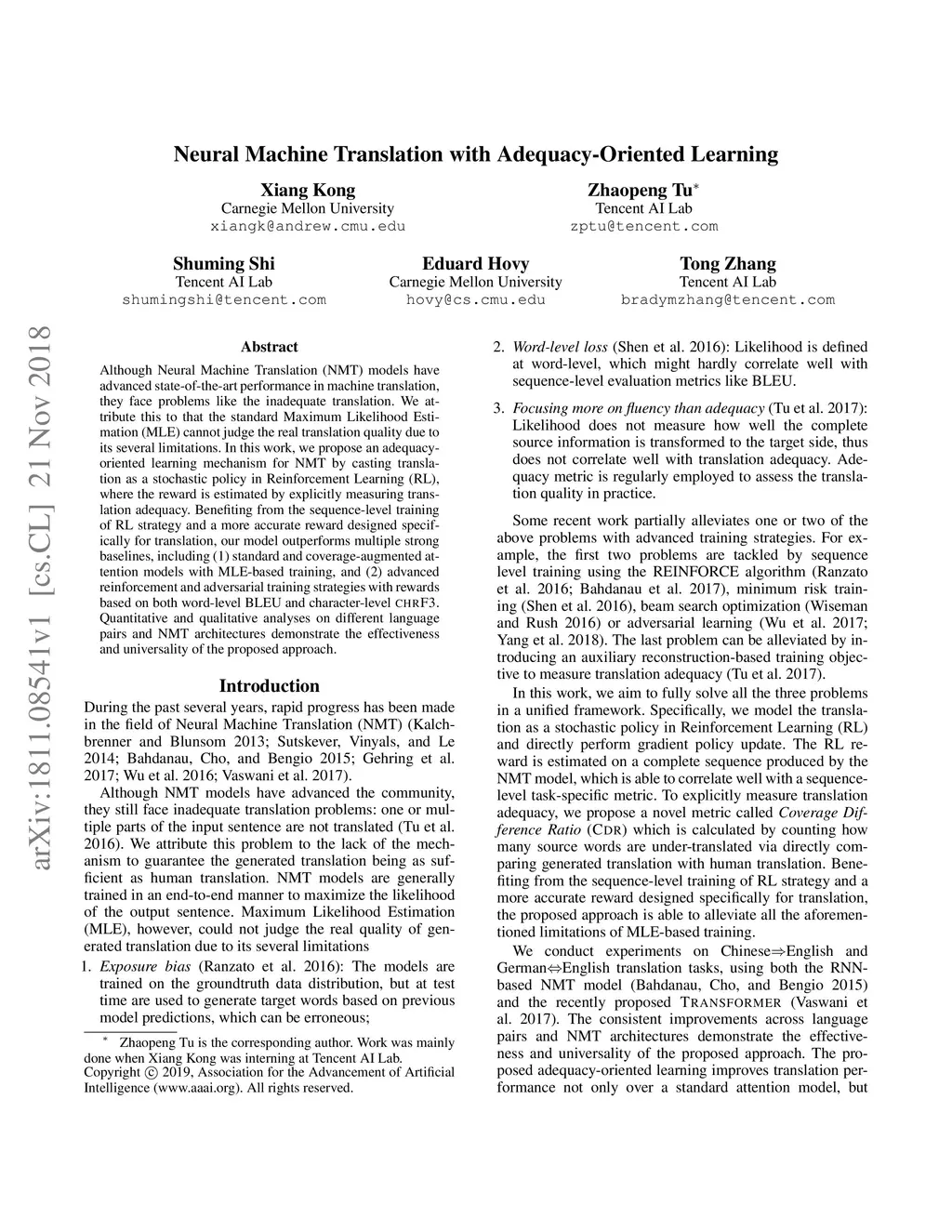 Although Neural Machine Translation (NMT) models have advanced state-of-the-art performance in machine translation, they face problems like the inadequate translation. We attribute this to that the standard Maximum Likelihood Estimation (MLE) cannot judge the real translation quality due to its several limitations. In this work, we propose an adequacy-oriented learning mechanism for NMT by casting translation as a stochastic policy in Reinforcement Learning (RL), where the reward is estimated by explicitly measuring translation adequacy. Benefiting from the sequence-level training of RL strategy and a more accurate reward designed specifically for translation, our model outperforms multiple strong baselines, including (1) standard and coverage-augmented attention models with MLE-based training, and (2) advanced reinforcement and adversarial training strategies with rewards based on both word-level BLEU and character-level chrF3. Quantitative and qualitative analyses on different language pairs and NMT architectures demonstrate the effectiveness and universality of the proposed approach.