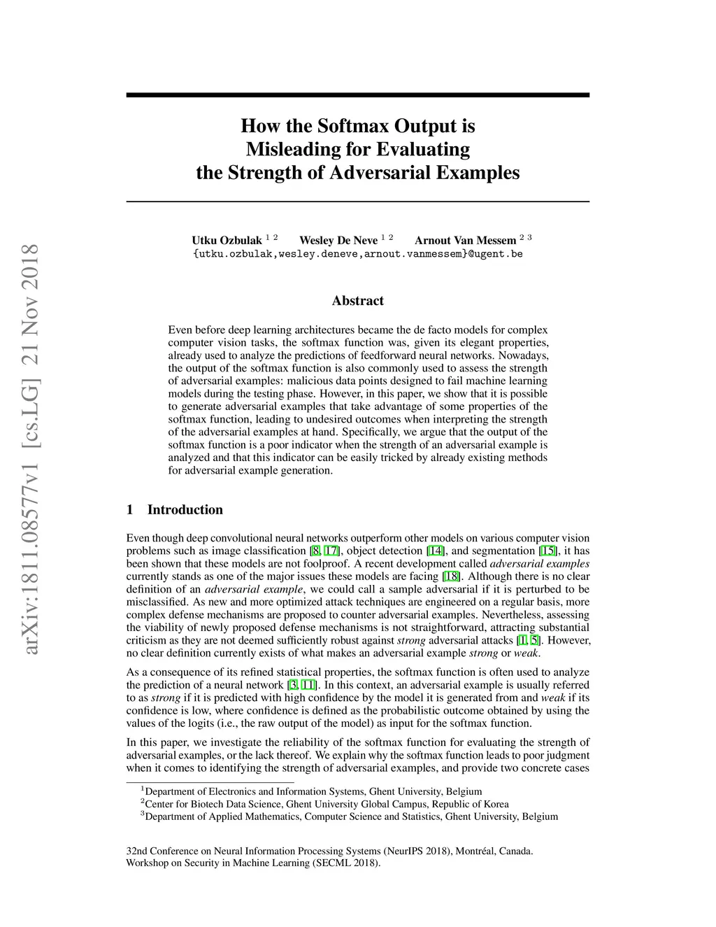 Even before deep learning architectures became the de facto models for complex computer vision tasks, the softmax function was, given its elegant properties, already used to analyze the predictions of feedforward neural networks. Nowadays, the output of the softmax function is also commonly used to assess the strength of adversarial examples: malicious data points designed to fail machine learning models during the testing phase. However, in this paper, we show that it is possible to generate adversarial examples that take advantage of some properties of the softmax function, leading to undesired outcomes when interpreting the strength of the adversarial examples at hand. Specifically, we argue that the output of the softmax function is a poor indicator when the strength of an adversarial example is analyzed and that this indicator can be easily tricked by already existing methods for adversarial example generation.