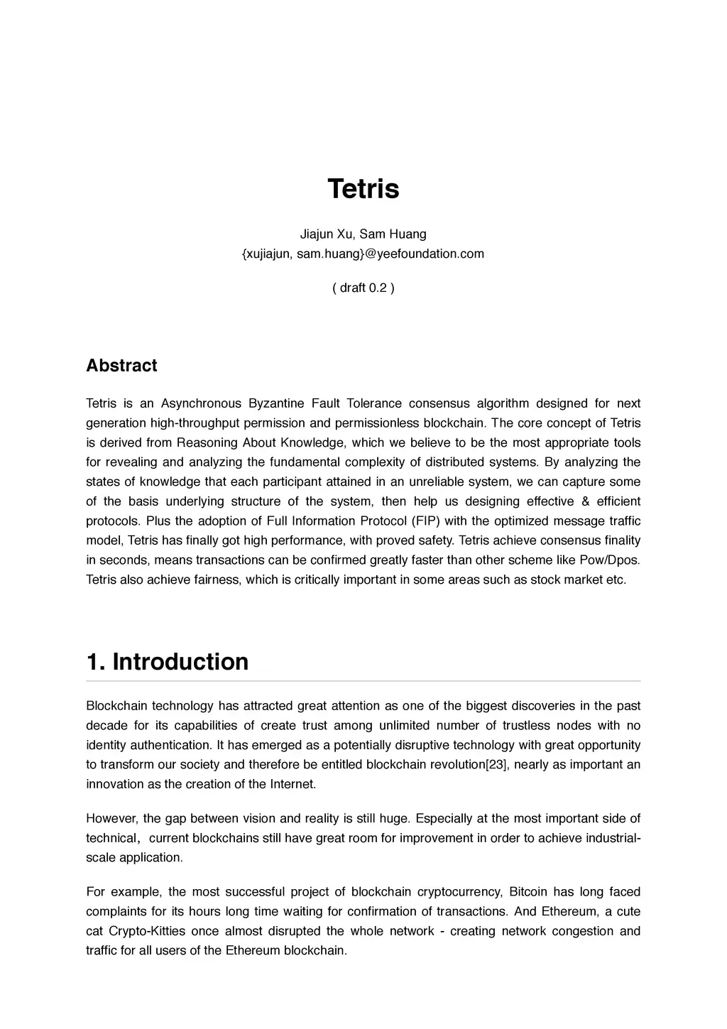 Tetris is an Asynchronous Byzantine Fault Tolerance consensus algorithm designed for next generation high-throughput permission and permissionless blockchain. The core concept of Tetris is derived from Reasoning About Knowledge, which we believe to be the most appropriate tools for revealing and analyzing the fundamental complexity of distributed systems. By analyzing the states of knowledge that each participant attained in an unreliable system, we can capture some of the basis underlying structure of the system, then help us designing effective & efficient protocols. Plus the adoption of Full Information Protocol (FIP) with the optimized message traffic model, Tetris has finally got high performance, with proved safety. Tetris achieve consensus finality in seconds, means transactions can be confirmed greatly faster than other scheme like Pow/Dpos. Tetris also achieve fairness, which is critically important in some areas such as stock market etc.