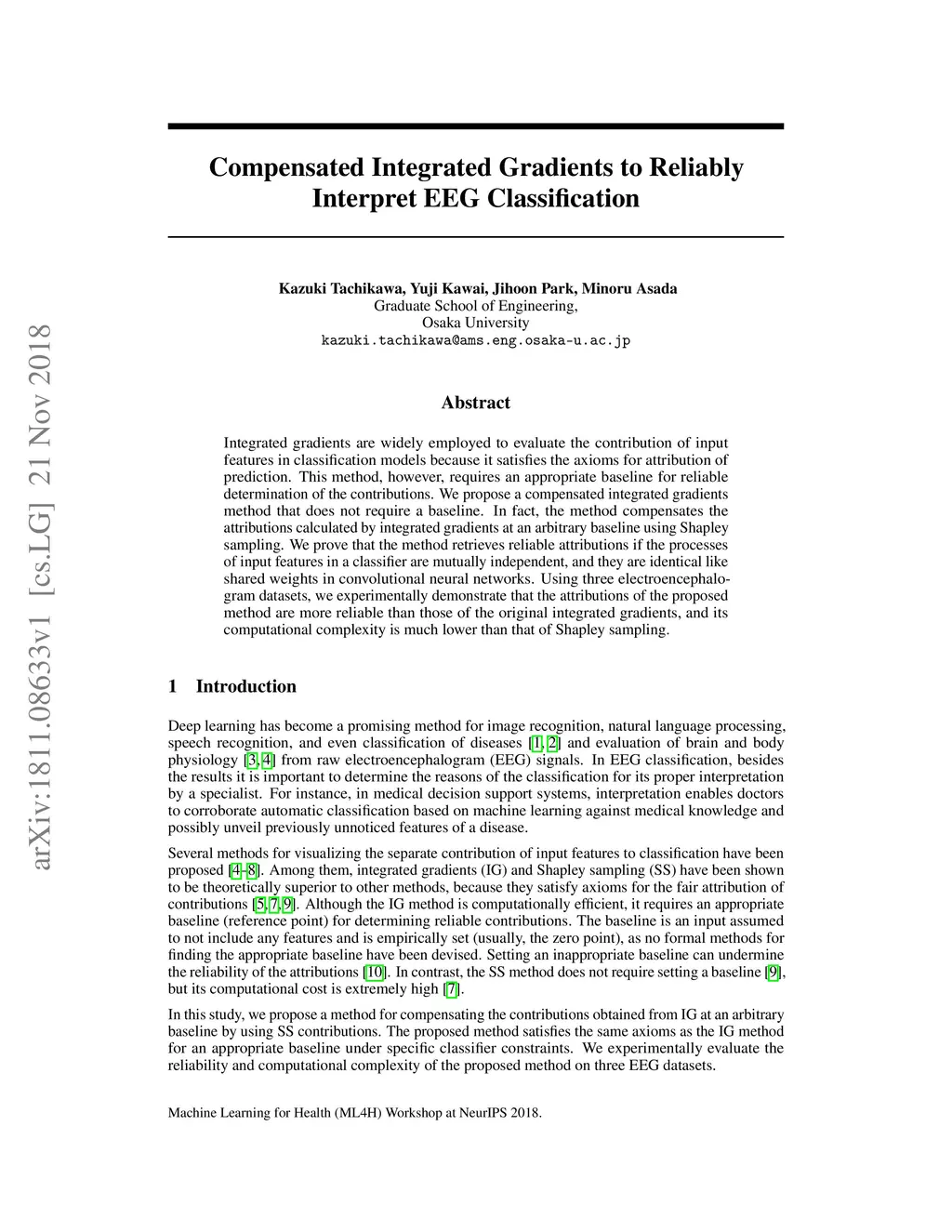 Integrated gradients are widely employed to evaluate the contribution of input features in classification models because it satisfies the axioms for attribution of prediction. This method, however, requires an appropriate baseline for reliable determination of the contributions. We propose a compensated integrated gradients method that does not require a baseline. In fact, the method compensates the attributions calculated by integrated gradients at an arbitrary baseline using Shapley sampling. We prove that the method retrieves reliable attributions if the processes of input features in a classifier are mutually independent, and they are identical like shared weights in convolutional neural networks. Using three electroencephalogram datasets, we experimentally demonstrate that the attributions of the proposed method are more reliable than those of the original integrated gradients, and its computational complexity is much lower than that of Shapley sampling.