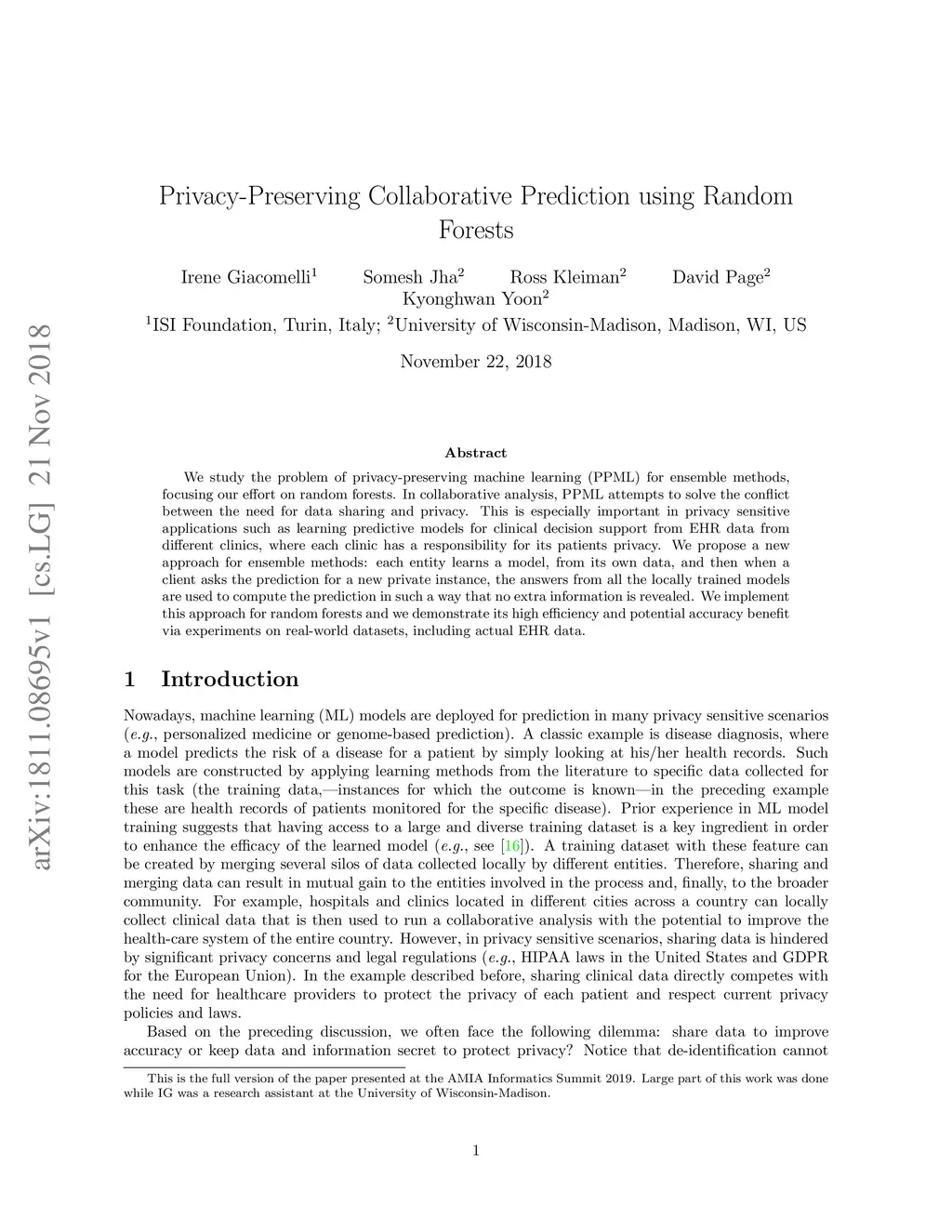 We study the problem of privacy-preserving machine learning (PPML) for ensemble methods, focusing our effort on random forests. In collaborative analysis, PPML attempts to solve the conflict between the need for data sharing and privacy. This is especially important in privacy sensitive applications such as learning predictive models for clinical decision support from EHR data from different clinics, where each clinic has a responsibility for its patients' privacy. We propose a new approach for ensemble methods: each entity learns a model, from its own data, and then when a client asks the prediction for a new private instance, the answers from all the locally trained models are used to compute the prediction in such a way that no extra information is revealed. We implement this approach for random forests and we demonstrate its high efficiency and potential accuracy benefit via experiments on real-world datasets, including actual EHR data.