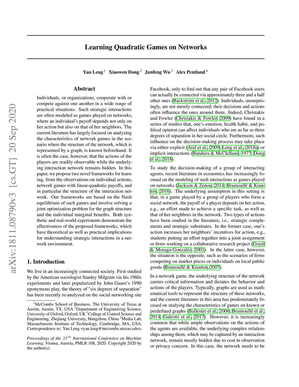 Learning Quadratic Games on Networks