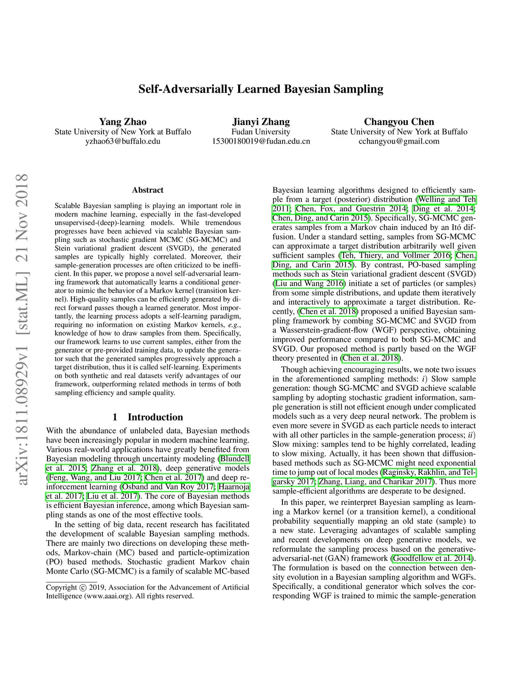 Scalable Bayesian sampling is playing an important role in modern machine learning, especially in the fast-developed unsupervised-(deep)-learning models. While tremendous progresses have been achieved via scalable Bayesian sampling such as stochastic gradient MCMC (SG-MCMC) and Stein variational gradient descent (SVGD), the generated samples are typically highly correlated. Moreover, their sample-generation processes are often criticized to be inefficient. In this paper, we propose a novel self-adversarial learning framework that automatically learns a conditional generator to mimic the behavior of a Markov kernel (transition kernel). High-quality samples can be efficiently generated by direct forward passes though a learned generator. Most importantly, the learning process adopts a self-learning paradigm, requiring no information on existing Markov kernels, e.g., knowledge of how to draw samples from them. Specifically, our framework learns to use current samples, either from the generator or pre-provided training data, to update the generator such that the generated samples progressively approach a target distribution, thus it is called self-learning. Experiments on both synthetic and real datasets verify advantages of our framework, outperforming related methods in terms of both sampling efficiency and sample quality.