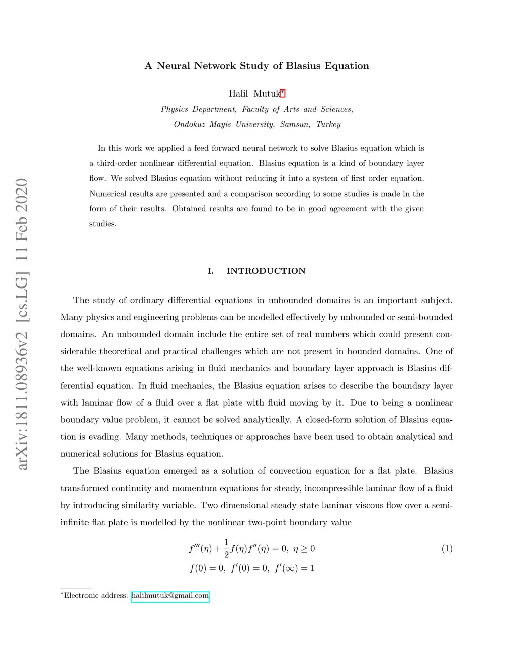 In this work we applied a feed forward neural network to solve Blasius equation which is a third-order nonlinear differential equation. Blasius equation is a kind of boundary layer flow. We solved Blasius equation without reducing it into a system of first order equation. Numerical results are presented and a comparison according to some studies is made in the form of their results. Obtained results are found to be in good agreement with the given studies.