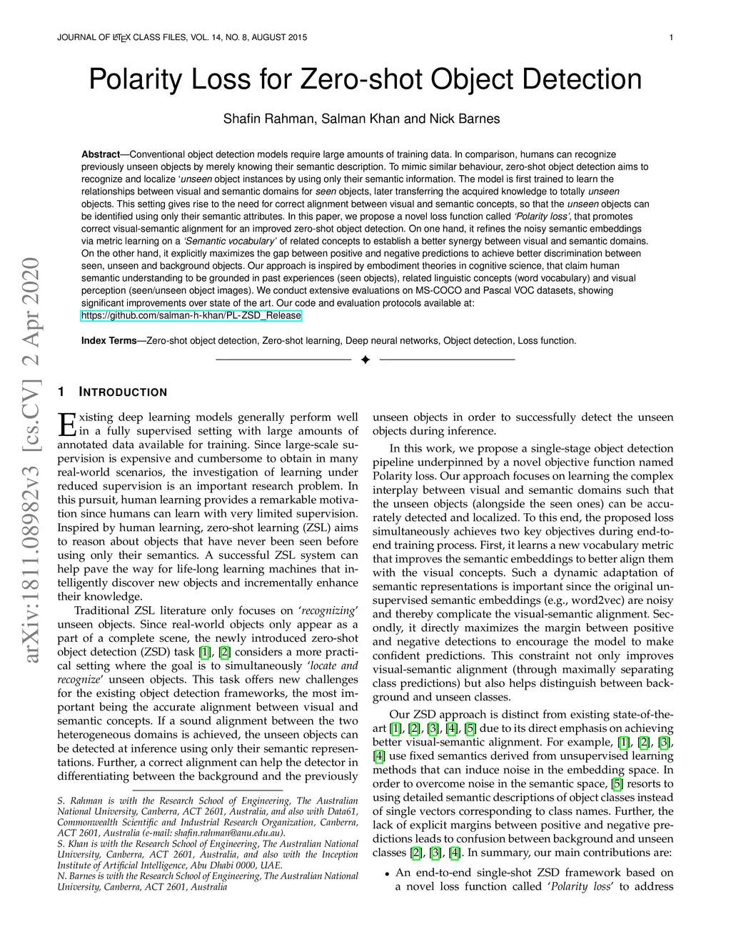 Conventional object detection models require large amounts of training data. In comparison, humans can recognize previously unseen objects by merely knowing their semantic description. To mimic similar behaviour, zero-shot object detection aims to recognize and localize únseen' object instances by using only their semantic information. The model is first trained to learn the relationships between visual and semantic domains for seen objects, later transferring the acquired knowledge to totally unseen objects. This setting gives rise to the need for correct alignment between visual and semantic concepts, so that the unseen objects can be identified using only their semantic attributes. In this paper, we propose a novel loss function called 'Polarity loss', that promotes correct visual-semantic alignment for an improved zero-shot object detection. On one hand, it refines the noisy semantic embeddings via metric learning on a 'Semantic vocabulary' of related concepts to establish a better synergy between visual and semantic domains. On the other hand, it explicitly maximizes the gap between positive and negative predictions to achieve better discrimination between seen, unseen and background objects. Our approach is inspired by embodiment theories in cognitive science, that claim human semantic understanding to be grounded in past experiences (seen objects), related linguistic concepts (word vocabulary) and visual perception (seen/unseen object images). We conduct extensive evaluations on MS-COCO and Pascal VOC datasets, showing significant improvements over state of the art.