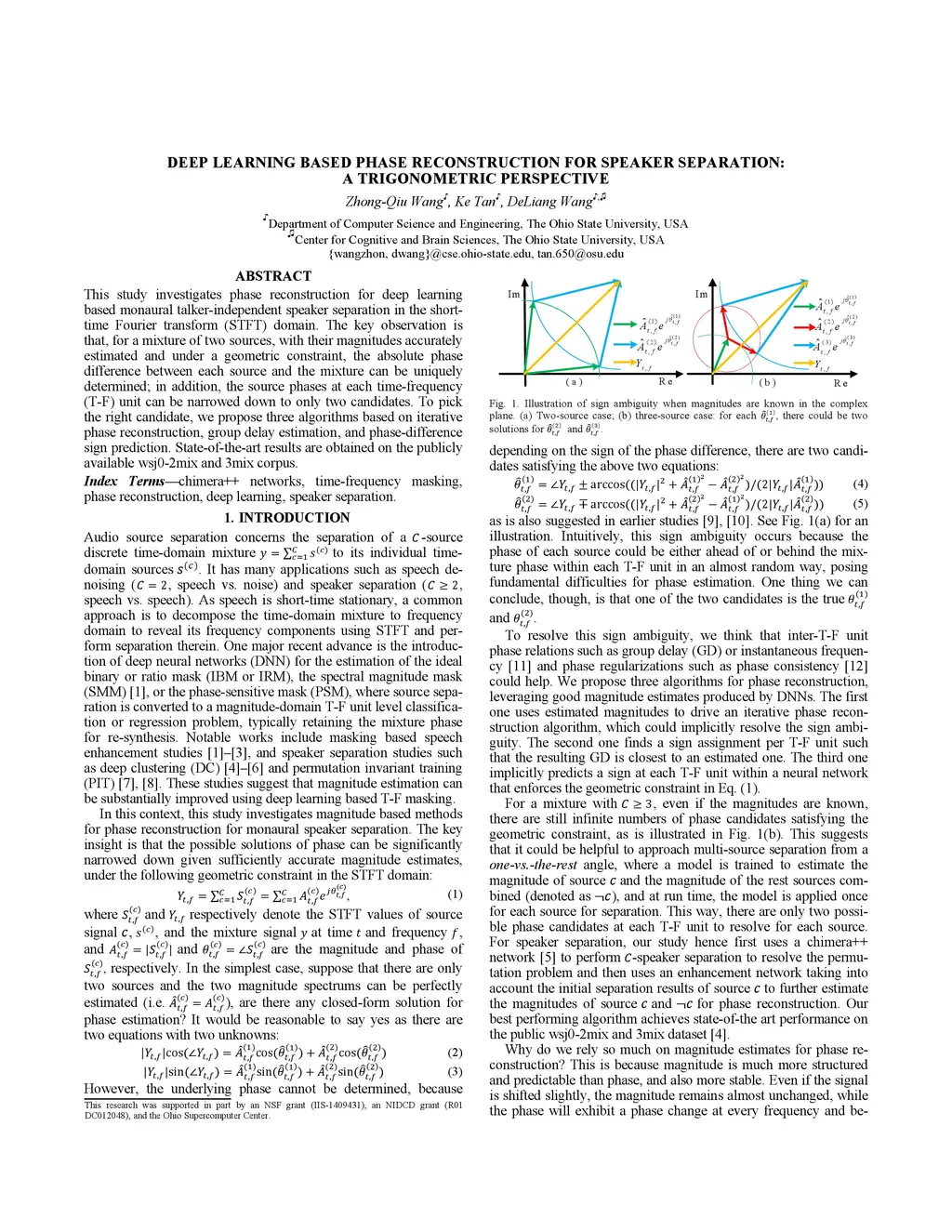 This study investigates phase reconstruction for deep learning based monaural talker-independent speaker separation in the short-time Fourier transform (STFT) domain. The key observation is that, for a mixture of two sources, with their magnitudes accurately estimated and under a geometric constraint, the absolute phase difference between each source and the mixture can be uniquely determined; in addition, the source phases at each time-frequency (T-F) unit can be narrowed down to only two candidates. To pick the right candidate, we propose three algorithms based on iterative phase reconstruction, group delay estimation, and phase-difference sign prediction. State-of-the-art results are obtained on the publicly available wsj0-2mix and 3mix corpus.