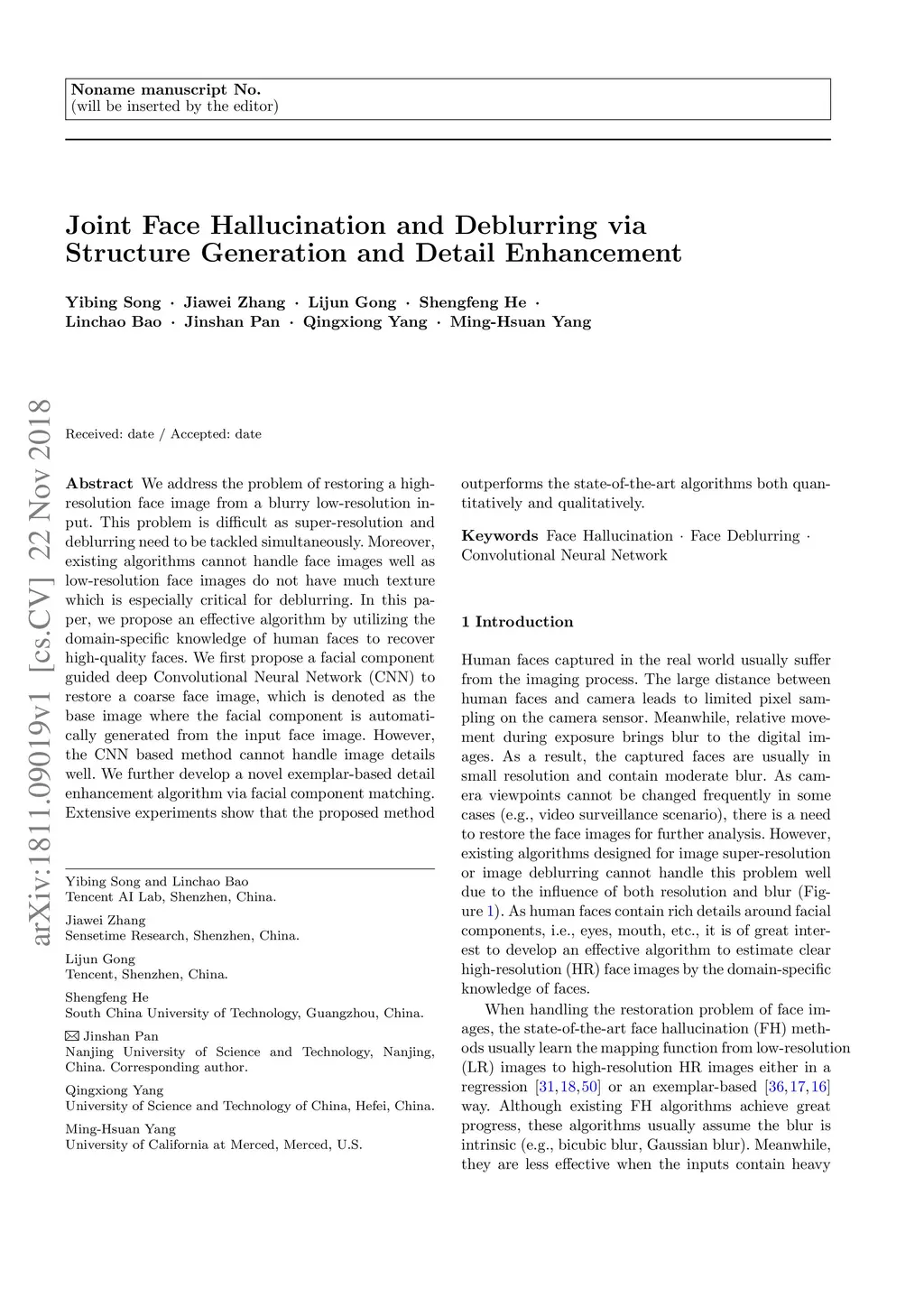 Joint Face Hallucination and Deblurring via Structure Generation and