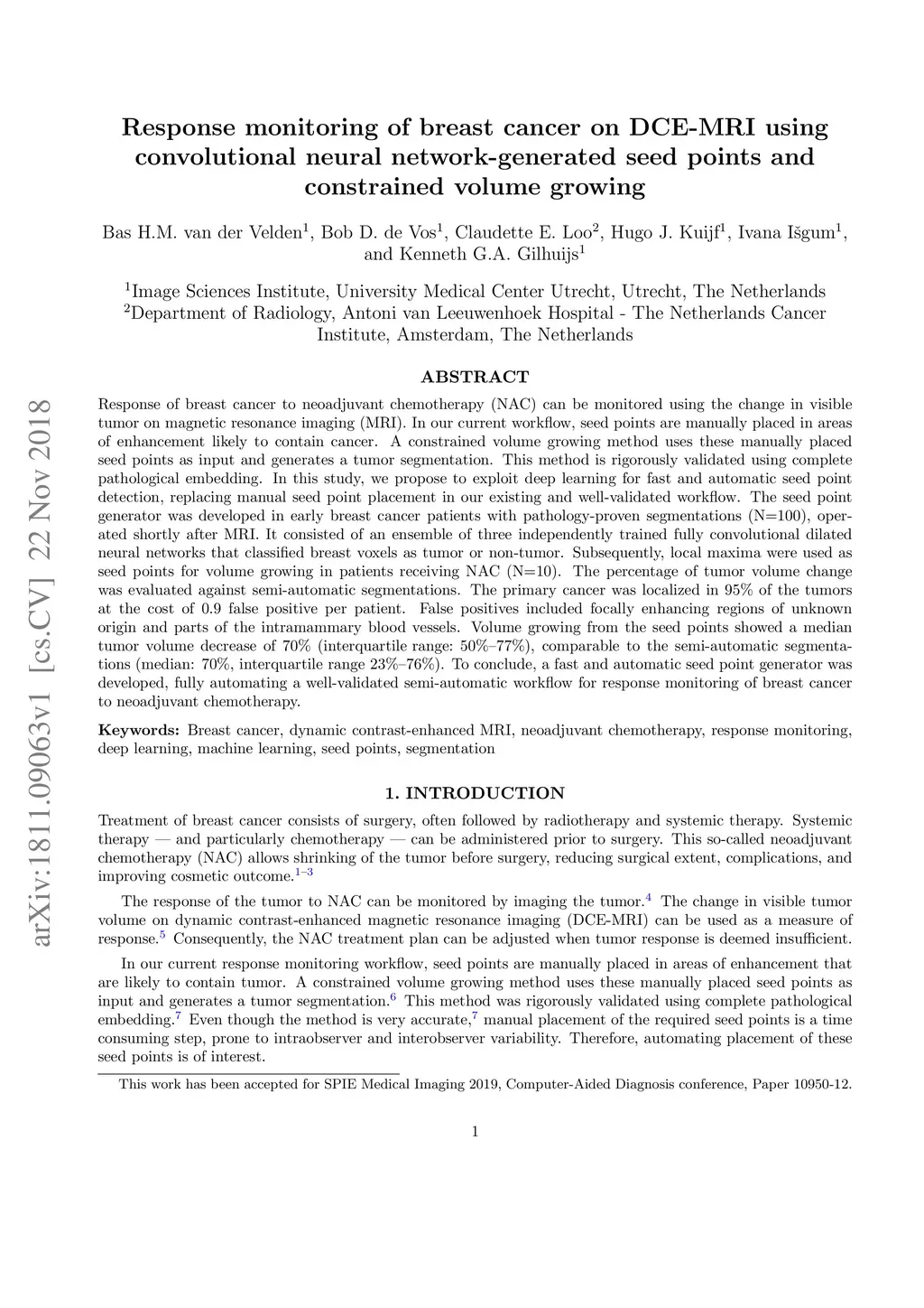 Response of breast cancer to neoadjuvant chemotherapy (NAC) can be monitored using the change in visible tumor on magnetic resonance imaging (MRI). In our current workflow, seed points are manually placed in areas of enhancement likely to contain cancer. A constrained volume growing method uses these manually placed seed points as input and generates a tumor segmentation. This method is rigorously validated using complete pathological embedding. In this study, we propose to exploit deep learning for fast and automatic seed point detection, replacing manual seed point placement in our existing and well-validated workflow. The seed point generator was developed in early breast cancer patients with pathology-proven segmentations (N=100), operated shortly after MRI. It consisted of an ensemble of three independently trained fully convolutional dilated neural networks that classified breast voxels as tumor or non-tumor. Subsequently, local maxima were used as seed points for volume growing in patients receiving NAC (N=10). The percentage of tumor volume change was evaluated against semi-automatic segmentations. The primary cancer was localized in 95% of the tumors at the cost of 0.9 false positive per patient. False positives included focally enhancing regions of unknown origin and parts of the intramammary blood vessels. Volume growing from the seed points showed a median tumor volume decrease of 70% (interquartile range: 50%-77%), comparable to the semi-automatic segmentations (median: 70%, interquartile range 23%-76%). To conclude, a fast and automatic seed point generator was developed, fully automating a well-validated semi-automatic workflow for response monitoring of breast cancer to neoadjuvant chemotherapy.