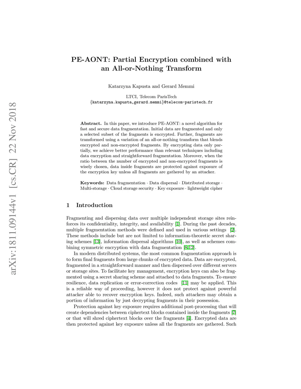 In this report, we introduce PE-AONT: a novel algorithm for fast and secure data fragmentation. Initial data are fragmented and only a selected subset of the fragments is encrypted. Further, fragments are transformed using a variation of an all-or-nothing transform that blends encrypted and non-encrypted fragments. By encrypting data only partially, we achieve better performance than relevant techniques including data encryption and straightforward fragmentation. Moreover, when the ratio between the number of encrypted and non-encrypted fragments is wisely chosen, data inside fragments are protected against exposure of the encryption key unless all fragments are gathered by an attacker.