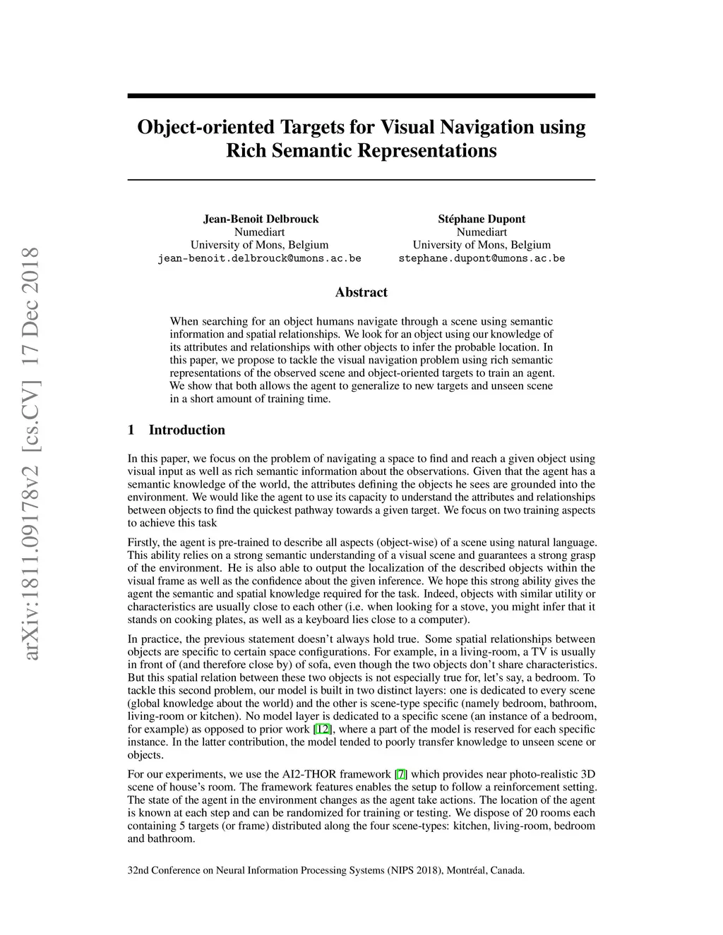 When searching for an object humans navigate through a scene using semantic information and spatial relationships. We look for an object using our knowledge of its attributes and relationships with other objects to infer the probable location. In this paper, we propose to tackle the visual navigation problem using rich semantic representations of the observed scene and object-oriented targets to train an agent. We show that both allows the agent to generalize to new targets and unseen scene in a short amount of training time.