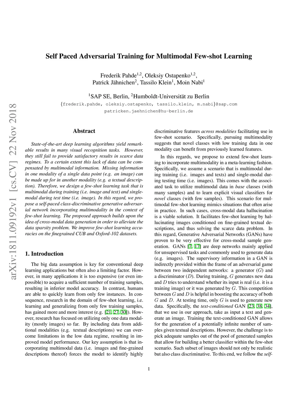 Self Paced Adversarial Training for Multimodal Few-shot Learning