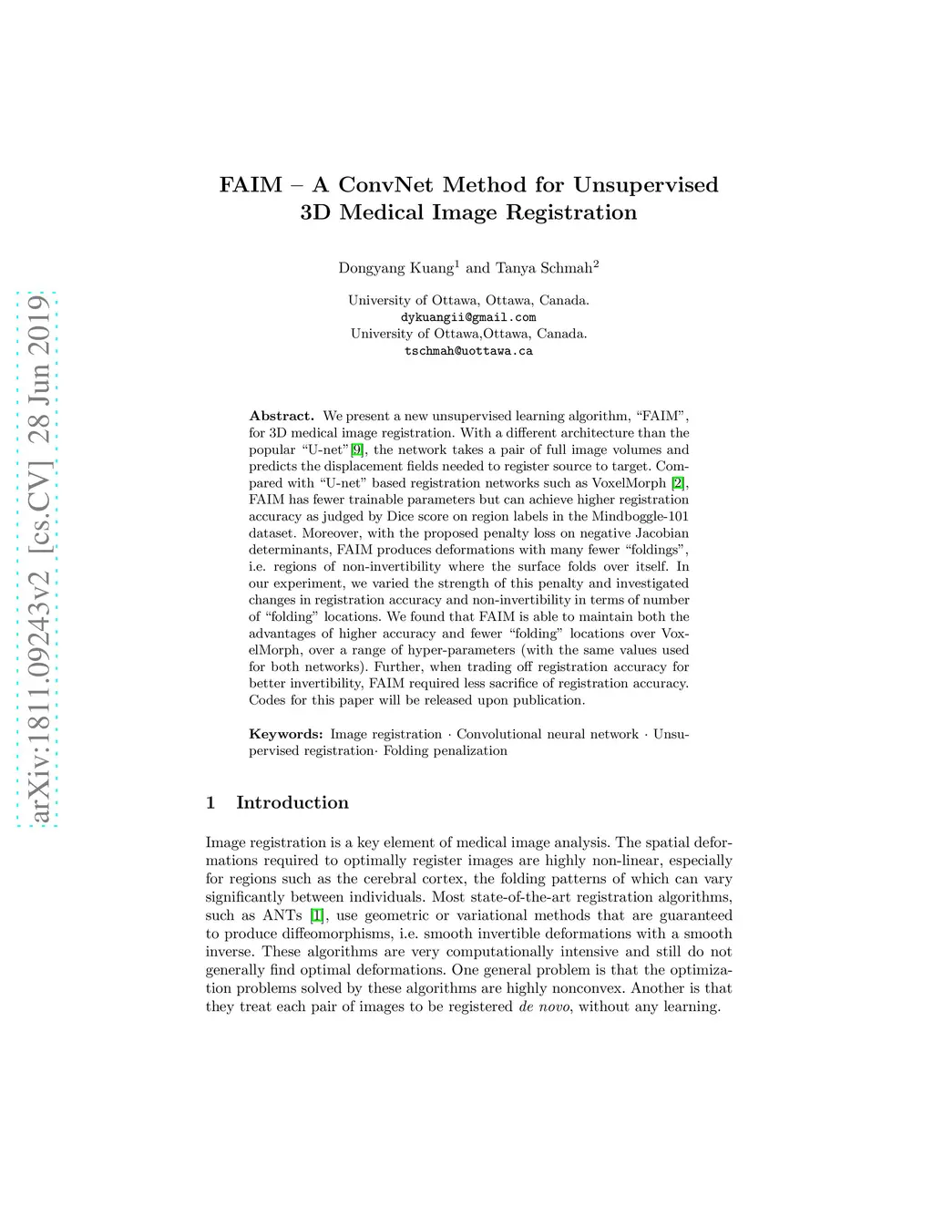 We present a new unsupervised learning algorithm, "FAIM", for 3D medical image registration. With a different architecture than the popular "U-net", the network takes a pair of full image volumes and predicts the displacement fields needed to register source to target. Compared with "U-net" based registration networks such as VoxelMorph, FAIM has fewer trainable parameters but can achieve higher registration accuracy as judged by Dice score on region labels in the Mindboggle-101 dataset. Moreover, with the proposed penalty loss on negative Jacobian determinants, FAIM produces deformations with many fewer "foldings", i.e. regions of non-invertibility where the surface folds over itself. In our experiment, we varied the strength of this penalty and investigated changes in registration accuracy and non-invertibility in terms of number of "folding" locations. We found that FAIM is able to maintain both the advantages of higher accuracy and fewer "folding" locations over VoxelMorph, over a range of hyper-parameters (with the same values used for both networks). Further, when trading off registration accuracy for better invertibility, FAIM required less sacrifice of registration accuracy. Codes for this paper will be released upon publication.