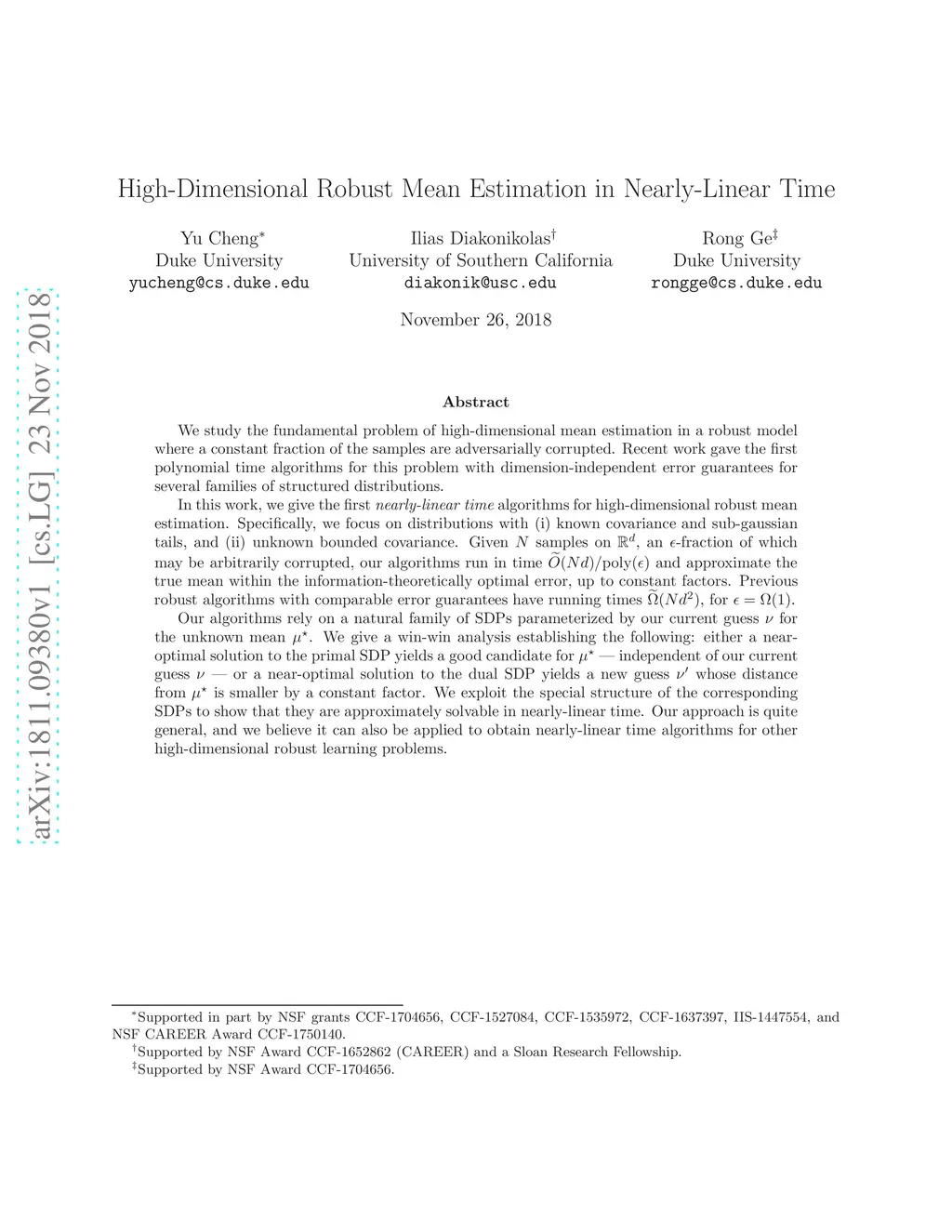We study the fundamental problem of high-dimensional mean estimation in a robust model where a constant fraction of the samples are adversarially corrupted. Recent work gave the first polynomial time algorithms for this problem with dimension-independent error guarantees for several families of structured distributions. In this work, we give the first nearly-linear time algorithms for high-dimensional robust mean estimation. Specifically, we focus on distributions with (i) known covariance and sub-gaussian tails, and (ii) unknown bounded covariance. Given samples on , an -fraction of which may be arbitrarily corrupted, our algorithms run in time and approximate the true mean within the information-theoretically optimal error, up to constant factors. Previous robust algorithms with comparable error guarantees have running times , for . Our algorithms rely on a natural family of SDPs parameterized by our current guess for the unknown mean . We give a win-win analysis establishing the following: either a near-optimal solution to the primal SDP yields a good candidate for -- independent of our current guess -- or the dual SDP yields a new guess whose distance from is smaller by a constant factor. We exploit the special structure of the corresponding SDPs to show that they are approximately solvable in nearly-linear time. Our approach is quite general, and we believe it can also be applied to obtain nearly-linear time algorithms for other high-dimensional robust learning problems.