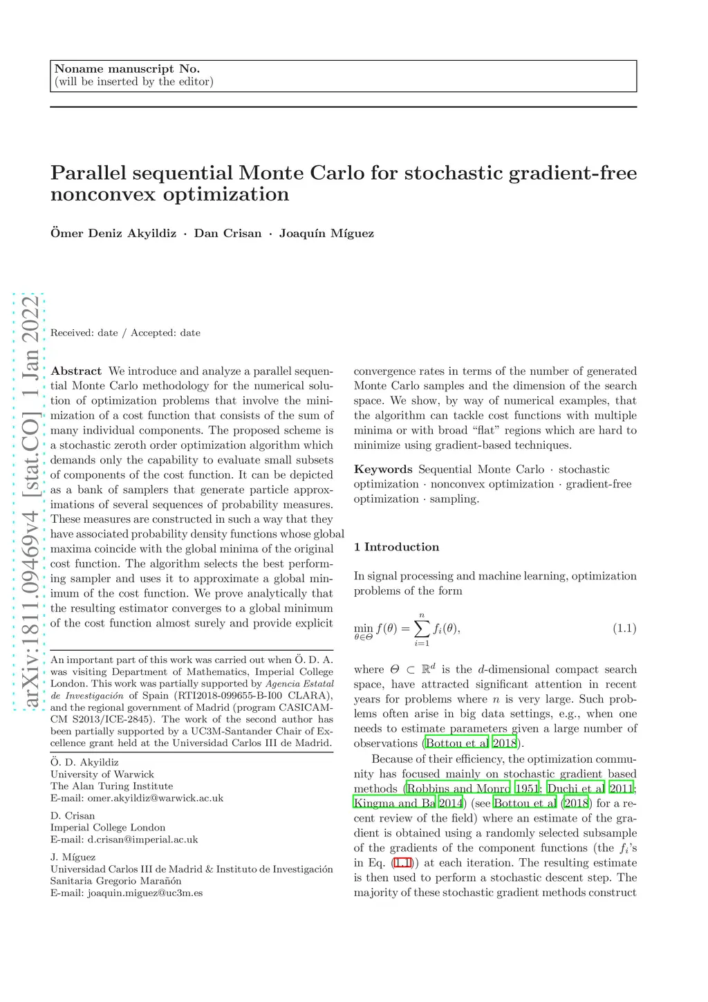 We introduce and analyze a parallel sequential Monte Carlo methodology for the numerical solution of optimization problems that involve the minimization of a cost function that consists of the sum of many individual components. The proposed scheme is a stochastic zeroth order optimization algorithm which demands only the capability to evaluate small subsets of components of the cost function. It can be depicted as a bank of samplers that generate particle approximations of several sequences of probability measures. These measures are constructed in such a way that they have associated probability density functions whose global maxima coincide with the global minima of the original cost function. The algorithm selects the best performing sampler and uses it to approximate a global minimum of the cost function. We prove analytically that the resulting estimator converges to a global minimum of the cost function almost surely and provide explicit convergence rates in terms of the number of generated Monte Carlo samples and the dimension of the search space. We show, by way of numerical examples, that the algorithm can tackle cost functions with multiple minima or with broad "flat" regions which are hard to minimize using gradient-based techniques.