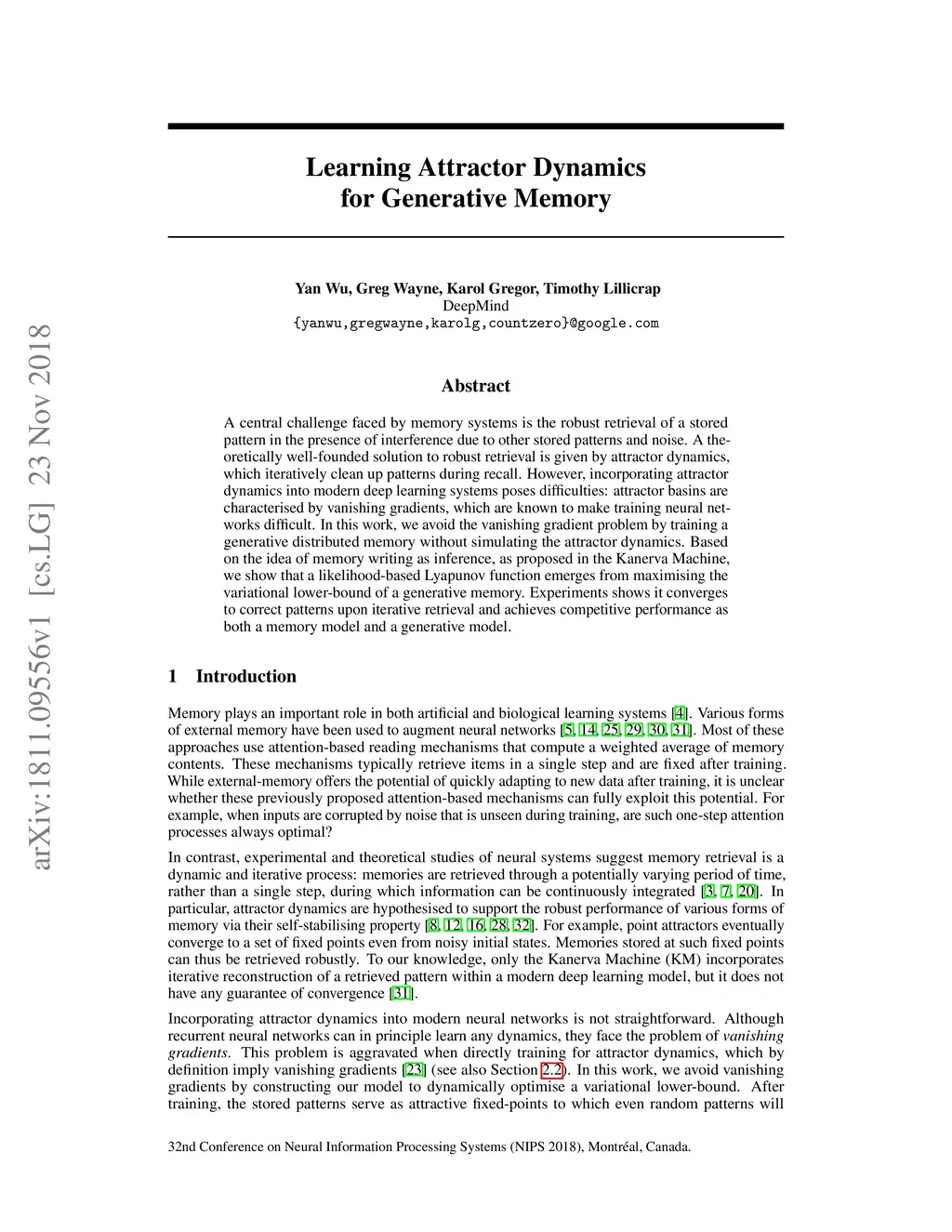 A central challenge faced by memory systems is the robust retrieval of a stored pattern in the presence of interference due to other stored patterns and noise. A theoretically well-founded solution to robust retrieval is given by attractor dynamics, which iteratively clean up patterns during recall. However, incorporating attractor dynamics into modern deep learning systems poses difficulties: attractor basins are characterised by vanishing gradients, which are known to make training neural networks difficult. In this work, we avoid the vanishing gradient problem by training a generative distributed memory without simulating the attractor dynamics. Based on the idea of memory writing as inference, as proposed in the Kanerva Machine, we show that a likelihood-based Lyapunov function emerges from maximising the variational lower-bound of a generative memory. Experiments shows it converges to correct patterns upon iterative retrieval and achieves competitive performance as both a memory model and a generative model.