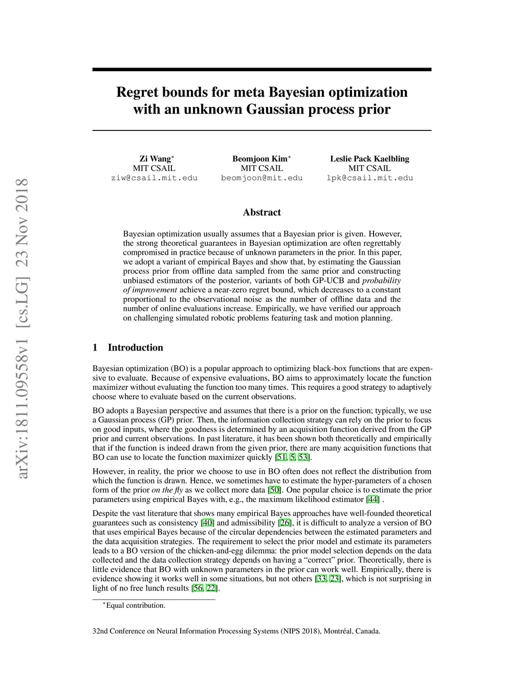 Bayesian optimization usually assumes that a Bayesian prior is given. However, the strong theoretical guarantees in Bayesian optimization are often regrettably compromised in practice because of unknown parameters in the prior. In this paper, we adopt a variant of empirical Bayes and show that, by estimating the Gaussian process prior from offline data sampled from the same prior and constructing unbiased estimators of the posterior, variants of both GP-UCB and probability of improvement achieve a near-zero regret bound, which decreases to a constant proportional to the observational noise as the number of offline data and the number of online evaluations increase. Empirically, we have verified our approach on challenging simulated robotic problems featuring task and motion planning.