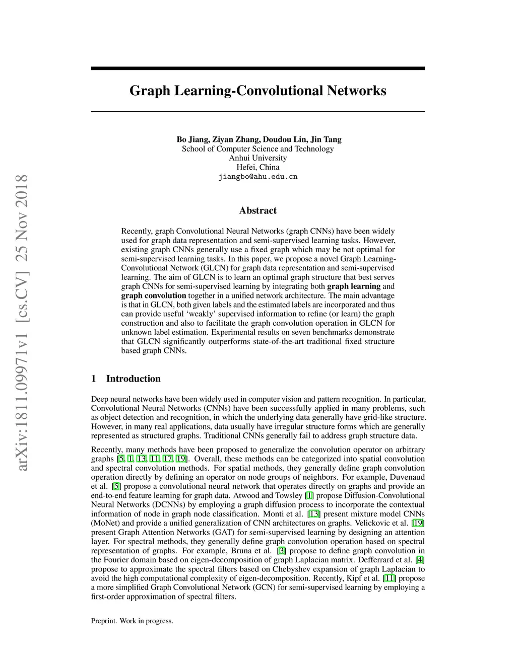 Recently, graph Convolutional Neural Networks (graph CNNs) have been widely used for graph data representation and semi-supervised learning tasks. However, existing graph CNNs generally use a fixed graph which may be not optimal for semi-supervised learning tasks. In this paper, we propose a novel Graph Learning-Convolutional Network (GLCN) for graph data representation and semi-supervised learning. The aim of GLCN is to learn an optimal graph structure that best serves graph CNNs for semi-supervised learning by integrating both graph learning and graph convolution together in a unified network architecture. The main advantage is that in GLCN, both given labels and the estimated labels are incorporated and thus can provide useful 'weakly' supervised information to refine (or learn) the graph construction and also to facilitate the graph convolution operation in GLCN for unknown label estimation. Experimental results on seven benchmarks demonstrate that GLCN significantly outperforms state-of-the-art traditional fixed structure based graph CNNs.